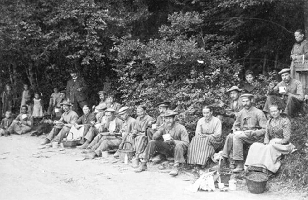 Diese Bergleute aus Kaub konnten ihre Mittagspause im Freien verbringen. Das Mittagessen wurde ihnen gebracht. Man sagt, dass dies normalerweise ebenfalls durch Kinder geschah. Wenn sich der Fotograf ankündigte, kamen die Frauen persönlich mit den Henkelmännern (um 1910, Bildarchiv Kauber Schiefer e.V.).