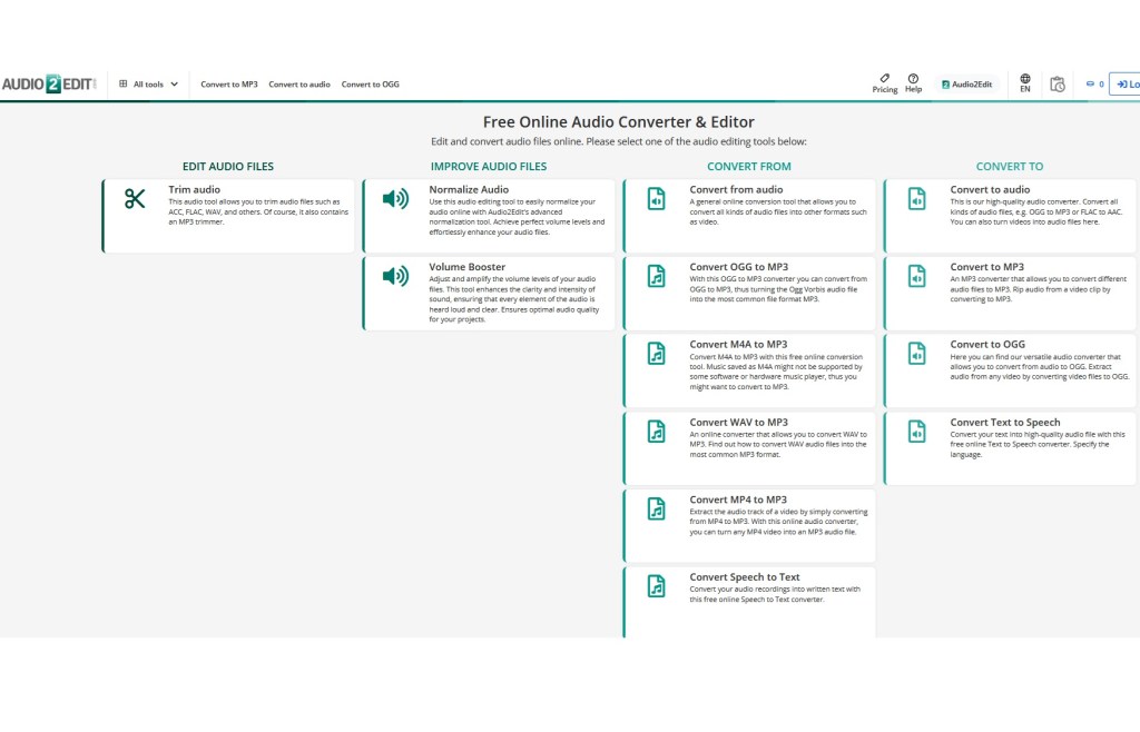 Screenshot der Webseite audio2edit.com mit den verschiedenen Funktionen.
