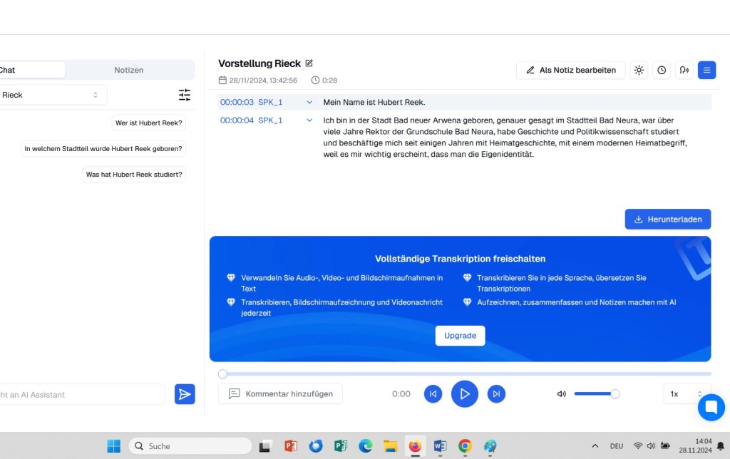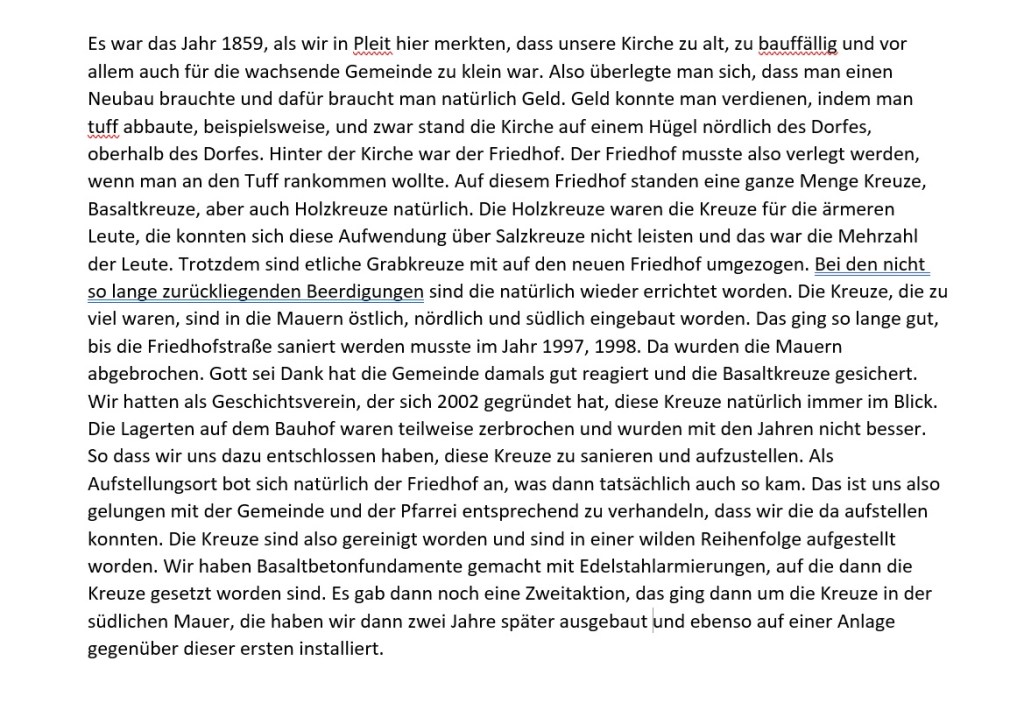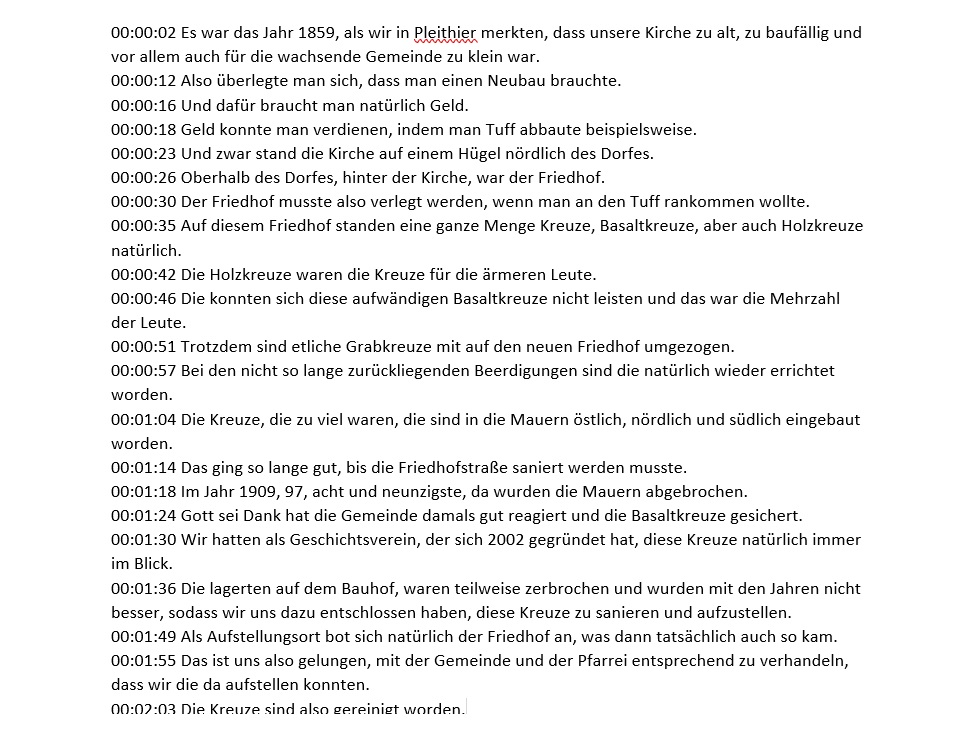 Dagegen lässt sich die Audio zu Text-Funktion recht gut nutzen. Wir haben testweise folgendes Audio aus Plaidt (es spricht Frank Neupert vom Plaidter Geschichtsverein e.V.) konvertiert: