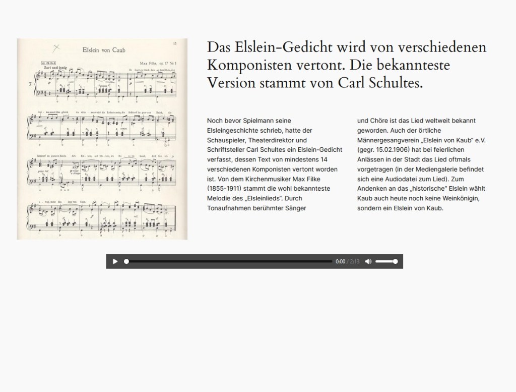 Ein weiterer Vorteil der digitalen Wissensvermittlung mittels eigens gestalteter Seiten ist der, dass jedes Objekt und jedes Thema frei behandelt werden kann. Die weit gefasste thematische und teilweise auch objektunabhängige Bandbreite von Themenbeiträgen, die aufgrund gewiss sinnvoller Vorgaben in KuLaDig nicht möglich ist, kann auf diese Weise anschauich umgesetzt werden. Als Beispiel ist die Sage vom Elslein von Kaub anzuführen, für die es in KuLaDig keinen konkreten Ortsbezug gibt, so dass sie lediglich am Beitrag zur Stadt Kaub angehängt werden kann. Unsere Storytelling-Seiten kennen solche Restriktionen nicht und erlauben zugleich eine freie Anordnung der multimedialen Elemente.
