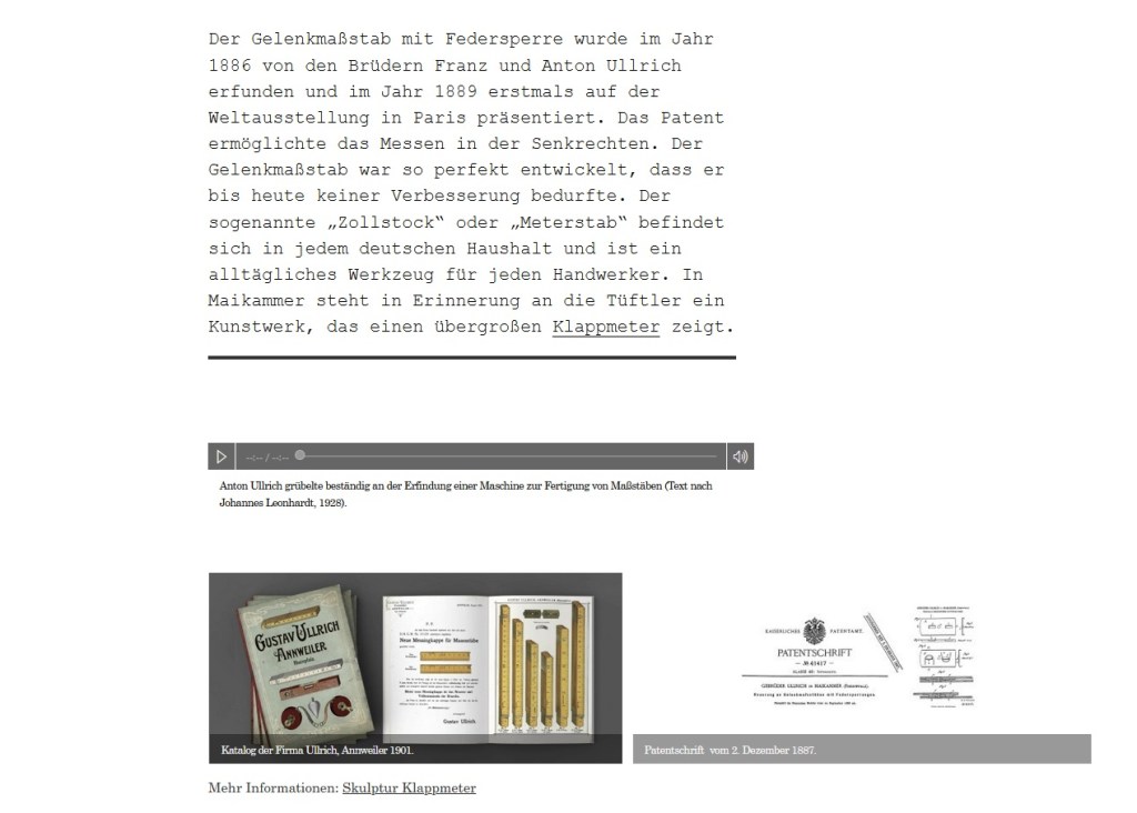 Screenshots der Multimedia-Scrollytelling-Seite „Industriegeschichte Maikammer„, die neben Texten auch Audios, Bilder und PDF-Dateien bereithält und parallel zum KuLaDig-Themenbeitrag existiert.