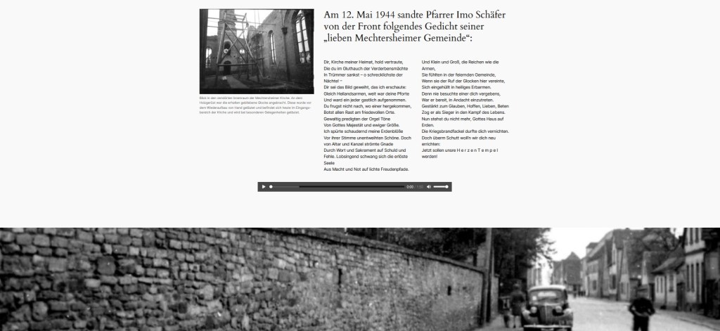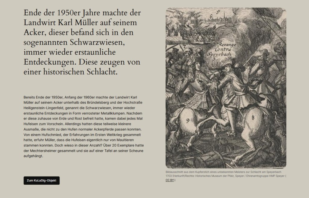 Auch die Lost Places in Römerberg bedürfen einer – ergänzend zu den KuLaDig-Beiträgen – gesonderten Präsentation über eigens erstellte Webseiten, um das verlorene Kulturgut wieder sichtbar und nachvollziehbar zu machen. Denn der Umstand, dass die Objekte die Zeiten bis heute nicht überdauerten und in der Landschaft kaum bis keine Spuren hinterließen, bildet eine Herausforderung, der die digitale Wissensvermittlung nur mit einer besonders flexiblen Medieneinbindung begegnen kann. Die in den Schwarzwiesen bei Römerberg-Heiligenstein gemachten Funde, die von der Schlacht bei Heiligenstein im Jahre 1703 künden, bedürfen zum Verständnis der damaligen Situation der großformatigen Verfügbarmachung historischer Karten sowie einer Erläuterung der in diesen Karten verzeichneten gegnerischen Stellungen – über die von uns angelegten WordPress-Seiten ist dies gewährleistet, zudem kompatibel für die Smartphone-Nutzung. Gleiches trifft auf die Darstellung der im Zweiten Weltkrieg zerstörten Mechtersheimer Kirche und die Vertonung der vom Pfarrer im Zuge dieser Zerstörung verfassten Kriegsgedichte zu, die ebenfalls auf einer eigenen Seite umgesetzt wurden.