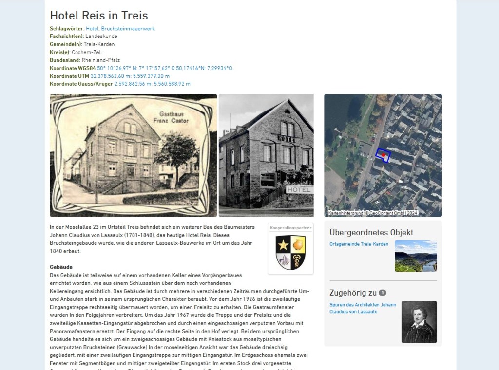 Screenshot des KuLaDig-Beitrags Hotel Reis in Treis. Das Objekt ist über einen Objekt- und ein Themenbezug in der Struktur der Datenbank mit anderen Beiträgen verknüpft.