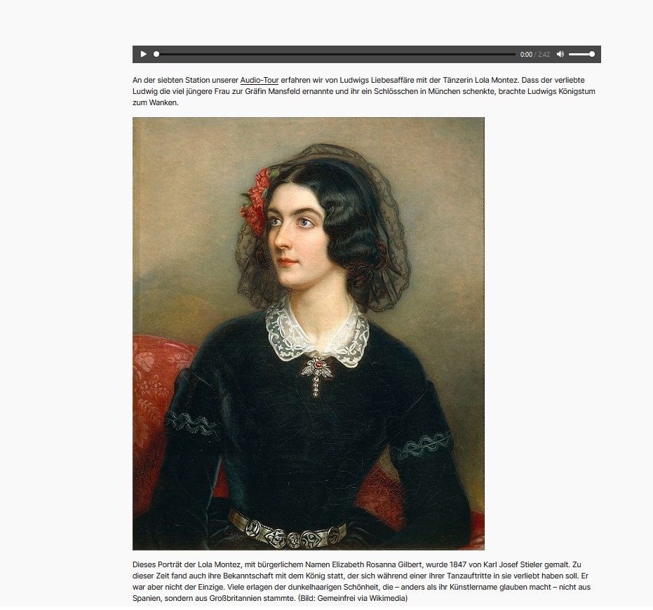 Ein weiteres Beispiel lässt sich in Edenkoben finden, wo wir gemeinsam mit unseren kommunalen Partner:innen 2023 den Themenweg „Spuren König Ludwigs von Bayern“ konzipierten und umsetzten. Da sich dieses Angebot in erster Linie an Familien mit Kindern richtet, war eine flexible Seitenstruktur mit großen Bildern, Audios und kleinen Quizzes vorgesehen. Ohne Umwege sollten die im Zentrum jeder Station stehenden Audiobeiträge direkt aufrufbar sein Jede Station bietet nunmehr einen prominent platzierten Hörbeitrag sowie rahmende Texte und Multimediabeiträge.