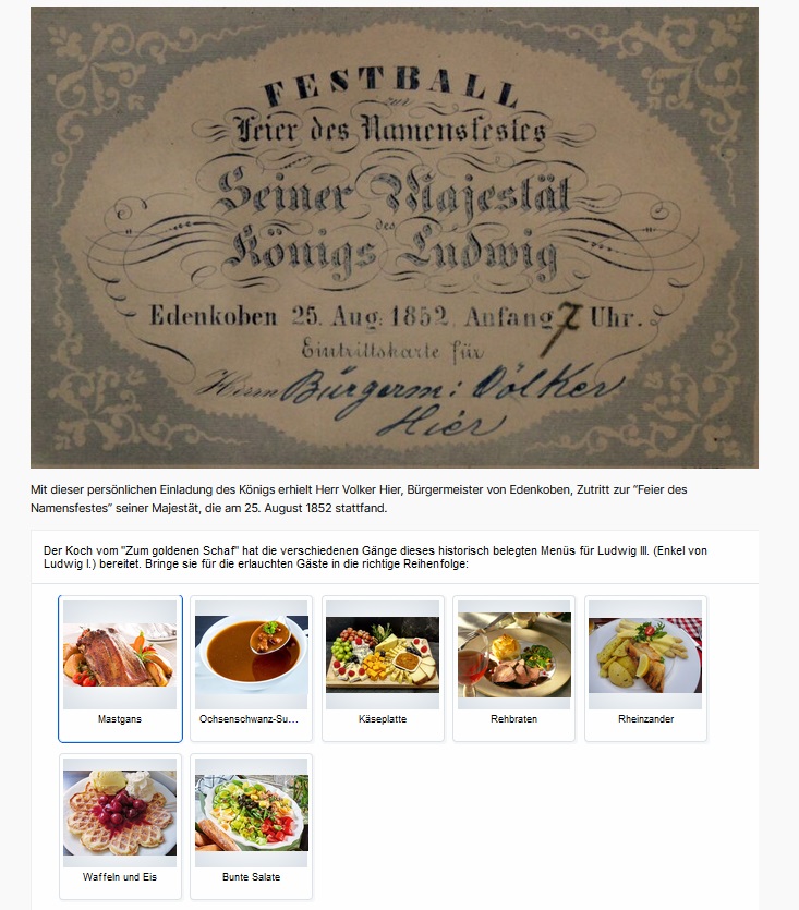 Die Edenkobener Seiten zielen in erster Linie auf Familien und Kinder ab. Aus diesem Grund sind die Audiodateien der Hörtour mit großformatigen Bildern (Beispiel Skulptur Tänzerin links) und Quizzes, hier ein Sortierspiel zu einem Menue des Bayerischen Königshofes (Beispiel Hotel zum Schaf rechts), angereichert.