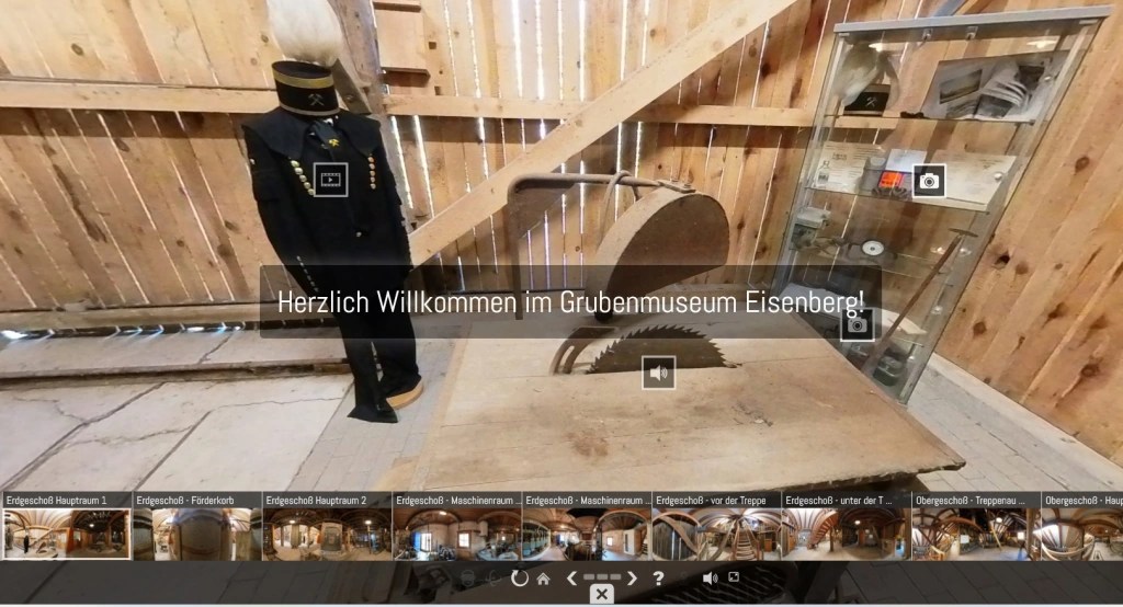 Ein Jahr später, 2021, folgte das Grubengebäude Riegelstein im ehemaligen Abbaugebiet Erdekaut bei Eisenberg. Dieses Fachmuseum war nach Stilllegung der Grube im einstigen Funktionsbau entstanden. Unsere Partnerin im Projekt Eisenberg arbeitete selbstständig in vr-easy und verortete die Vielzahl an (historischen) Videos, Bildern und Dokumenten an den passenden Stellen. Hier zeigt sich ein Vorteil des Digitalen, dass nämlich Videos und Audios, beispielsweise die Anekdoten von Zeitzeugen oder das Geräusch einer Säge, hier ganz unmittelbar sichtbar gemacht werden können, während im realen Museumsraum solche Einbindungen teure Bildschirme, Lautsprecher usw. bräuchten.
