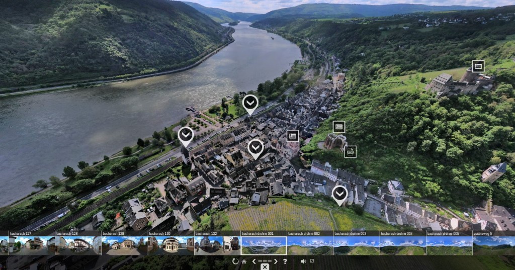 Und nichtsdestotrotz wurde bereits in Bacharach viel geleistet: Geplant ist, von Bacharach aus einen Weg über die Weinberghänge bis zur Burg Stahlberg umzusetzen. In regelmäßigen Abständen sollen Stationen entstehen, in denen einer möglichst breiten Zielgruppe zu einem bestimmten Ort oder einer bestimmten Fragestellung Inhalte vermittelt werden sollen – in einer spannenden Kombination von Kultur und Natur. Das kommunale Team lieferte bereits zwei 360-Grad-Touren, darunter auch 360-Grad-Drohnenflugaufnahmen für den Überblick. Auch wurden bereits Videoclips produziert, die sich zurzeit in der Nachbearbeitung befinden und in denen Expertinnen und Experten zu verschiedenen Themen informieren, beispielsweise zur Burg Stahlberg oder der besonderen, teils von den Römern eingeführten Pflanzenwelt.