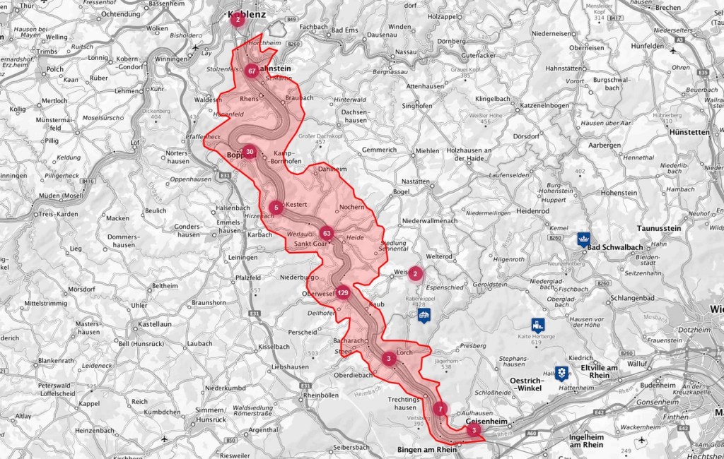 Dieser Kartenausschnitt zeigt den KuLaDig-Datenbestand im Oberen Mittelrheintal, insgesamt 307 Objekte.