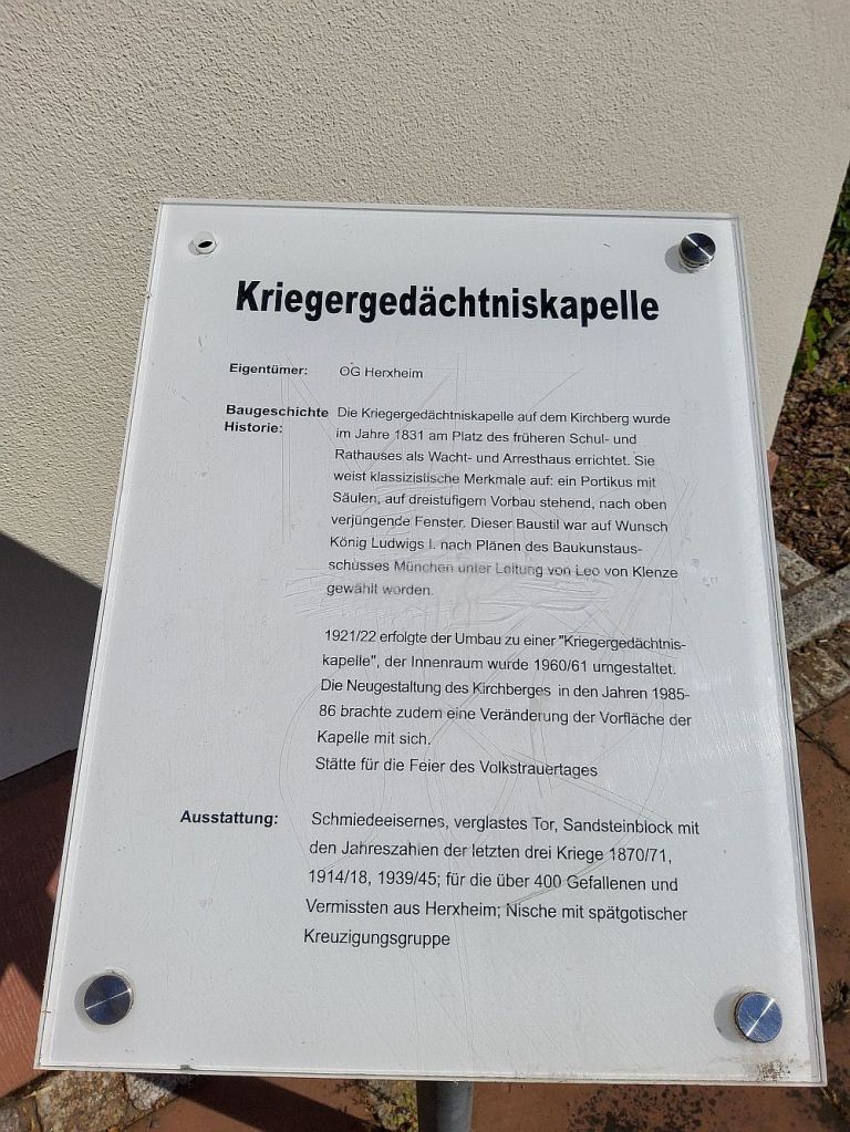In Herxheim, Modellkommune 2024, ging es vornehmlich darum Grabmäler von für die Stadtentwicklung bedeutsamer Personen auf dem Friedhof und auf dem Kirchhof in KuLaDig zu erfassen und mit Audiodateien auch als Hörstationen verfügbar zu machen. Ein weiterer Baustein dieses Teilprojekts, in dem das Gedenken an konkrete Menschen im Vordergrund steht, wurde dann die Kriegergedächtniskapelle auf dem Kirchberg, unser Objekt des Monats März.