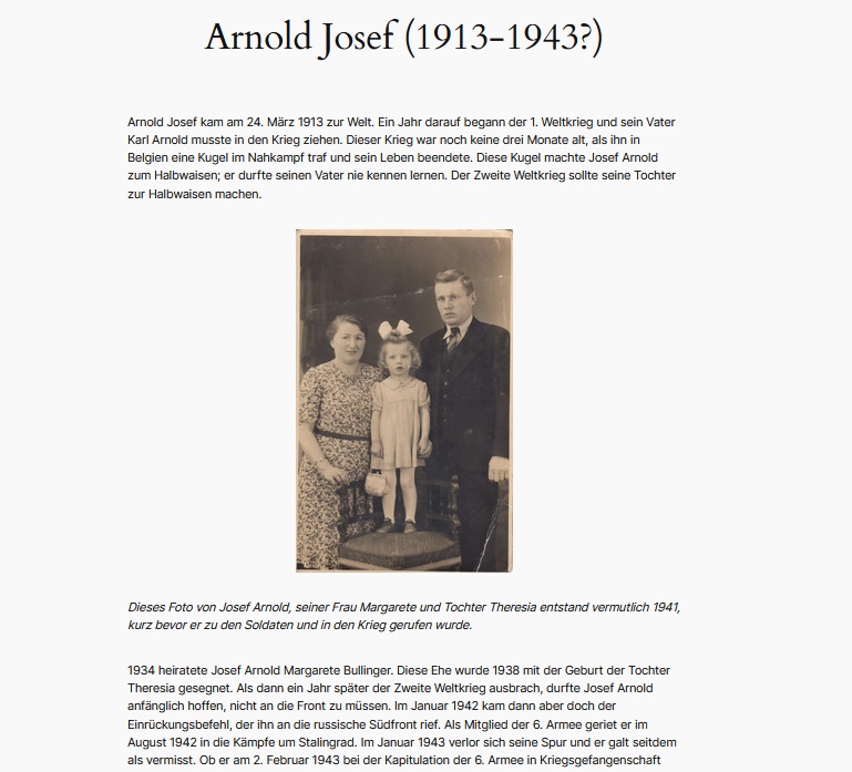Aus diesem Grund haben wir vom KuLaDig-Objekt aus Unterseiten angelegt, um den Gefallenen einen digitalen Gedächtnisraum zu geben. Auf den Unterseiten wird in einem knappen Beitrag und in der Regel mit Fotos, manchmal auch ergänzt durch eine Audiodatei, das kurze Leben der Gefallenen dargestellt. Ein Urteil über die Personen – wer von ihnen überzeugter Nazi und wer von ihnen ohne Wahl in den „Fleischwolf“ gezogen wurde, wollen wir nicht fällen.