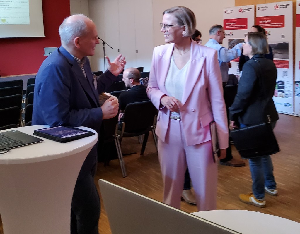 Stadtbürgermeister Jan Zimmer, Staatssekretärin Simone Schneider (MdI) sowie Landrat und Zweckverband-Vorstand Volker Boch (oben von links nach rechts) eröffneten mit ihren Grußworten die Auftaktveranstaltung. Untere Reihe: Reger Austausch der Teilnehmenden; Staatssekretärin Schneider im Gespräch mit Projektleiter Michael Klemm.