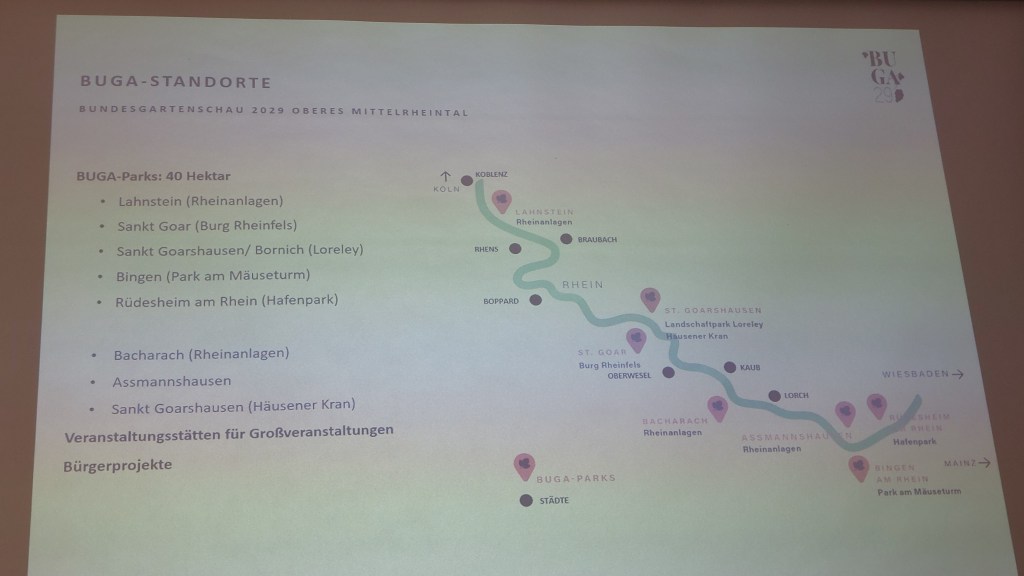 Dass die Vorbereitungen für die BUGA auf Hochtouren laufen wurde in einem Impulsvortrag von BUGA GmbH und Romantischer Rhein Tourismus GmbH deutlich, in dem spannende Einblicke in die organisatorische und touristische Arbeit gegeben wurden.