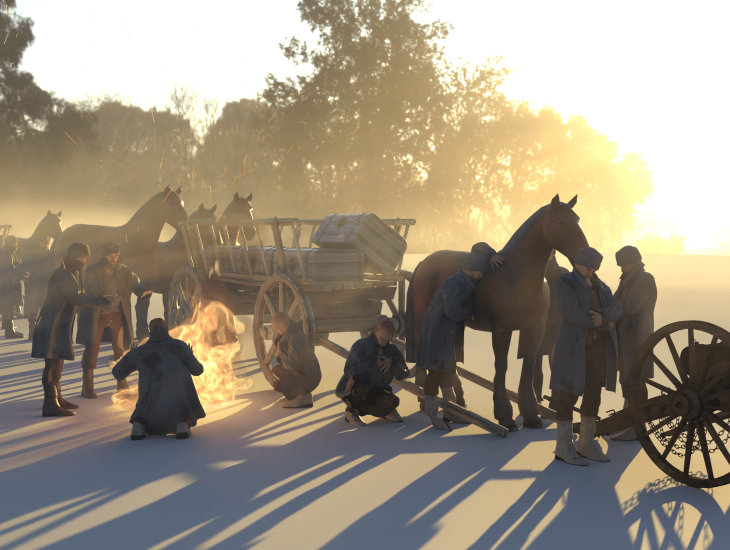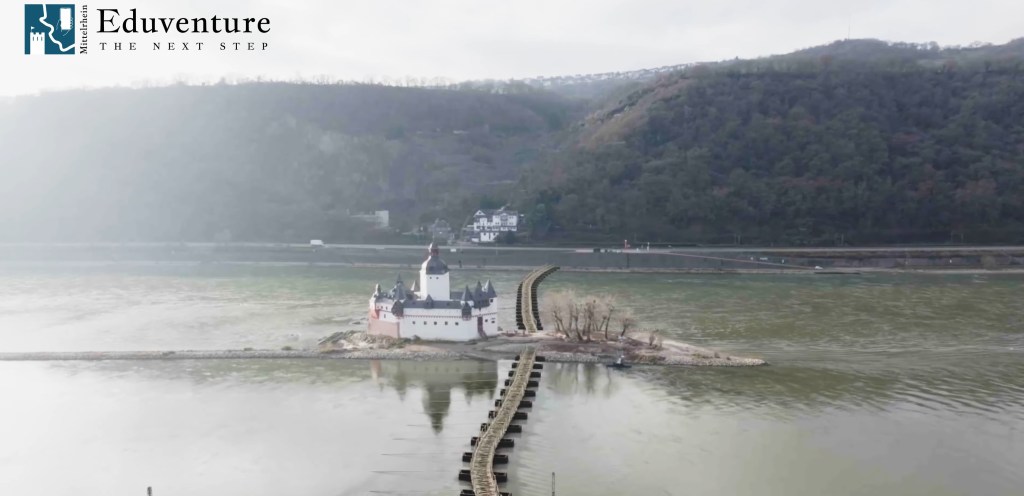 Weitere Versuche in Richtung Rekonstruktion unternahmen wir bei der Umsetzung des „Mittelrhein-Eduventures – The Next Step“, einem Pilotprojekt, das vom damaligen Institut für Wissensmedien der Universität Koblenz (heute Interdisziplinäres Zentrum für Lehre) geleitet und von uns tatkräftig unterstützt wurde. Das Mittelrhein-Eduventure verbindet in zwei digitalen Schnitzeljagden die Aspekte Wissensvermittlung und Abenteuer miteinander und führt die Spieler:innen ins Jahr 1812/13, als Generalfeldmarschall Blücher mit seiner 48.000 Soldaten starken Armee ohne Brücke den Rhein bei Kaub überquerte. Um ein möglichst eindrückliches Spielerlebnis zu kreieren, wurden im Projekt auch verschiedene Animationen erstellt. So wurde eine digitale Rekonstruktion der damaligen Pontonbrücke, mit der die Preußen den Rhein überquerten, in einem sehr aufwändigen Verfahren produziert – inklusive einzelner Pontons, die man individuell in 3D von allen Seiten betrachten kann. Auch der preußische Heereszug, der sich Kilometer lang erstreckte, wurde animiert – und dafür die eingekauften 3D-Soldaten eigens in den bemitleidenswerten Zustand transformiert, der laut Zeitzeugen typisch war nach mehreren Jahren Krieg.