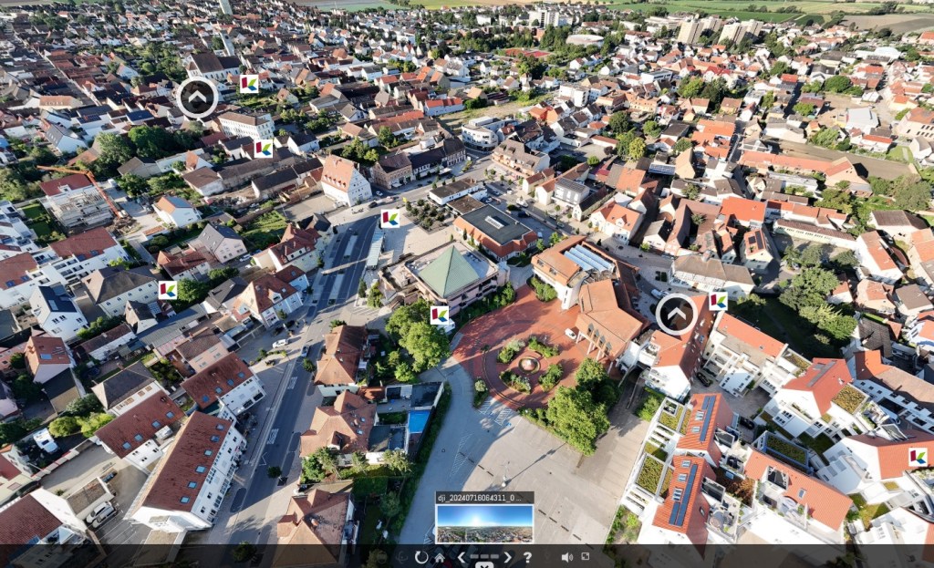 Screenshot der 360-Grad-Drohnenaufnahme, mittels derer man einen Überblick über alle KuLaDig-Objekte und 360-Grad-Touren bekommt. Hinter jedem „K“ verbirgt sich ein KuLaDig-Eintrag.