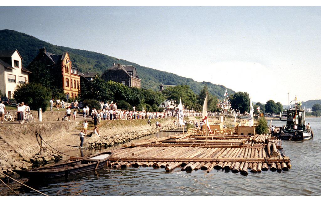 Am 7. August 1988 versammelte sich eine Vielzahl an Menschen am Kamp-Bornhofener Rheinufer. Angelockt wurden sie von einer Sehenswürdigkeit, die nur eine kurze Zeit Bestand haben sollte und die so schnell nicht noch einmal im Ort, ja nicht einmal im gesamten Welterbegebiet Oberes Mittelrheintal zu erleben sein würde. Es handelte sich um ein Rheinfloß aus verschiedenen Baumstämmen, von Hand zusammengestellt und damit in der traditionellen Bauart gefertigt. Die Länge betrug 110 Meter, die Breite 20 Meter. Dieses Floß war zum 700-jährigen Jubiläum der Stadt Düsseldorf (14. August 1988) erbaut worden und startete am 6. August in Mainz, machte in Kamp-Bornhofen eine erste Übernachtungsstation, bevor es nach weiteren Stationen am 11. August in Düsseldorf eintraf. Die vielen Menschen aus Kamp-Bornhofen und Umgebung, die das Floß besichtigten, machen einmal mehr deutlich, wie sehr sich die Ortsgemeinde mit der Flößerei identifiziert, .