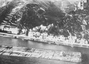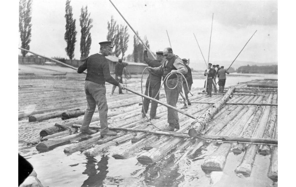 Wie groß die alten Rheinflöße waren, zeigt das historische Bild eines Floßes bei Sankt Goarshausen um 1900. Das zweite Bild zeigt Flößer beim „Einbinden“, also Zusammenbauen, eines Floßes.