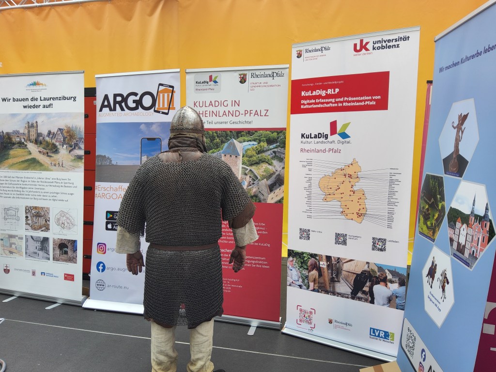Zudem gab es die Chance, neue Kooperationen zu vereinbaren. So wurde der Besuch von Michael Kirchschlager, Burgvogt der Marksburg oberhalb von Braubach und Geschäftsführer der Deutschen Burgenvereinigung, der im Rittergewand erschien, sofort genutzt, um mit ihm und Ulrich Linnemann, Kurator des Burgmuseums eine Zusammenarbeit für das Projekt „KuLaDig-RLP meets BUGA 2029“ zu vereinbaren.