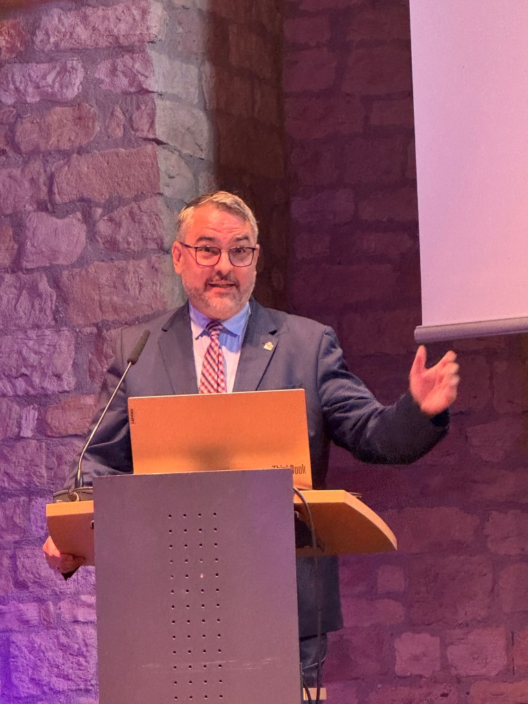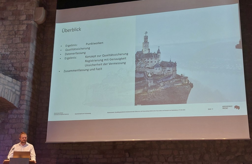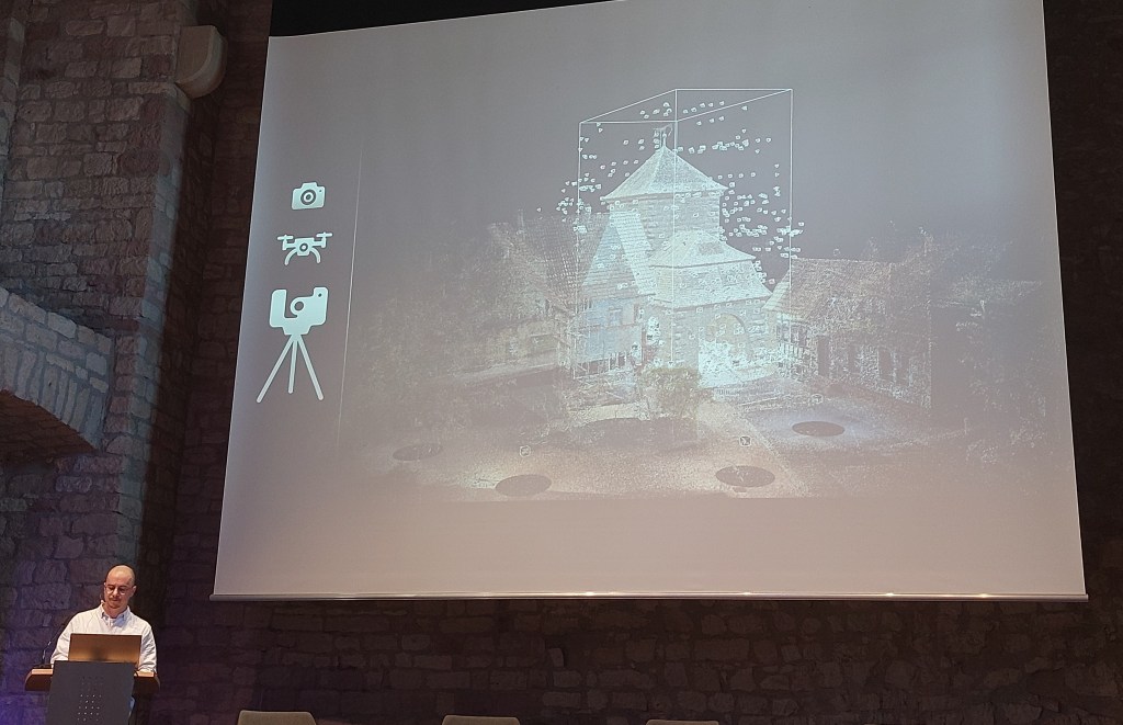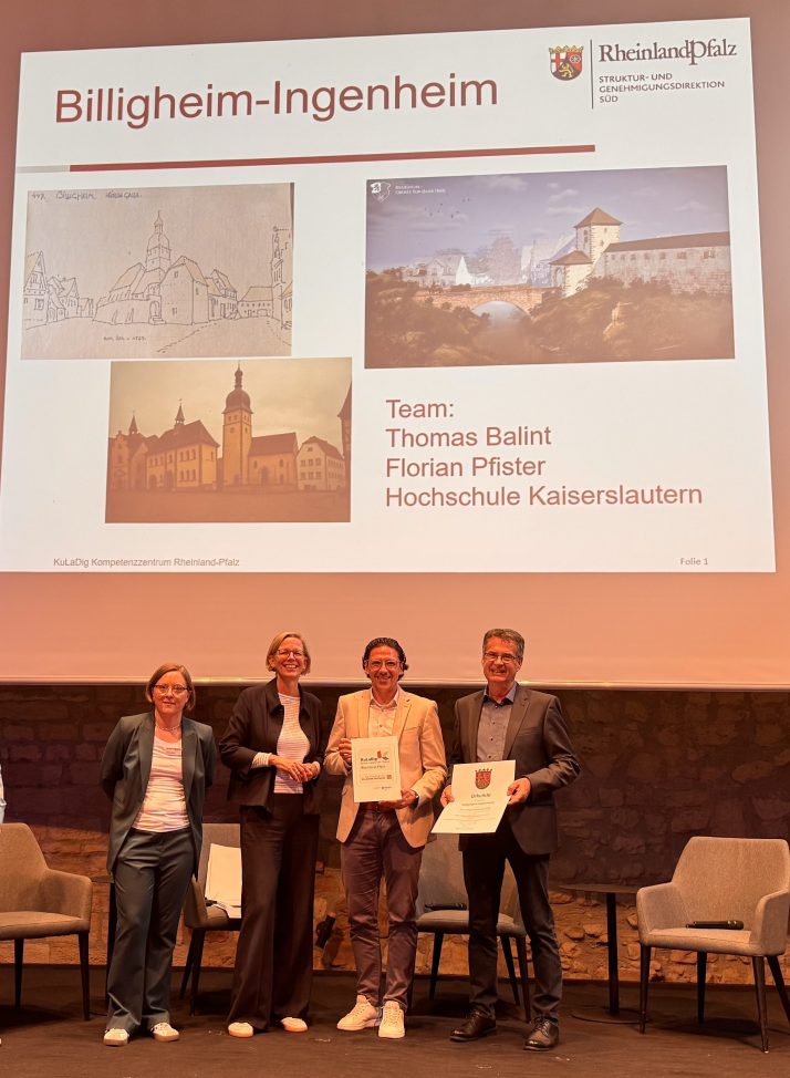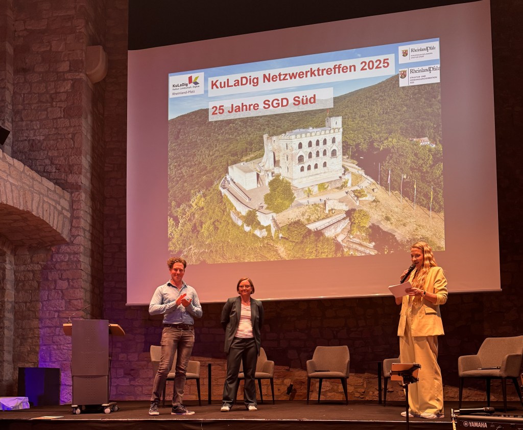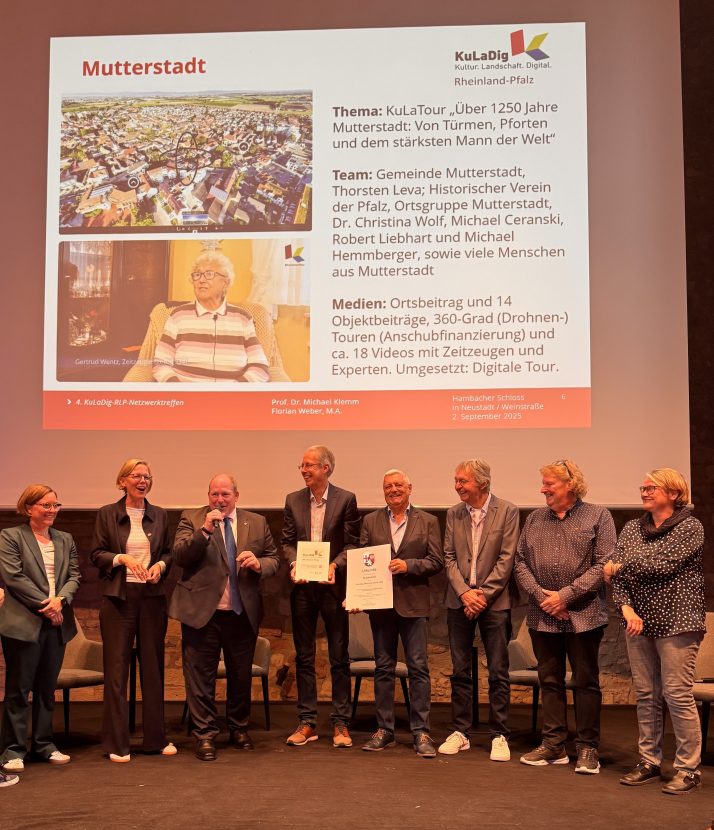 Nach der Pause ging es mit den Fachvorträgen weiter: KuLaDig-RLP-Projektleiter Prof. Dr. Michael Klemm skizzierte die Neuausrichtung im Landesprojekt, in der neben der Betreuung von Modellkommunen auch Aktivitäten in der BUGA-Region sowie der Aufbau eines digitalen KuLaDig-RLP-Campus zur Vermittlung von Medienkompetenzen an die Bürger:innen des Landes vorgesehen sind. Der 3D Environment Artist Lucas Musil stellte die digitale Rekonstruktion und Visualisierung von Billigheim vor, Christian Deichmann von der Hochschule Mainz gab Einblicke in die digitale Vermessung der Marksburg. Wie man in einem Ort Geschichte und Kultur für Bürger lokal erlebbar macht, Menschen zur Mitarbeit gewinnen kann und seitens der Kommune die Plattform KuLaDig für sich nutzen kann, erläuterte Michael Ceranski vom Historischen Verein der Pfalz, Ortsgruppe Mutterstadt, am Beispiel der erfolgreichen Umsetzung des Teilprojekts Mutterstadt im Jahre 2024 und der sich daraus entwickelten weiteren Möglichkeiten für die Partnerkommune.