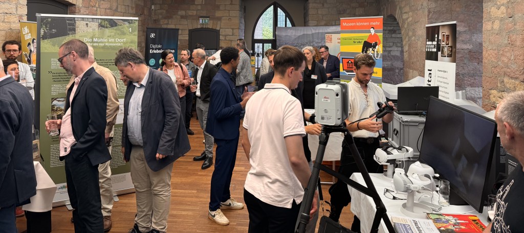 In der Mittagspause hatten die Teilnehmenden die Gelegenheit sich über diverse technische Anbieter und Umsetzungen im Bereich digitale Wissensvermittlung von kulturhistorischem Wissen zu informieren, in spannende Podcasts reinzuhören (Pickablue), verlorene Kulturgüter als virtuelle Rekonstruktionen zu betrachten (ARGO), historischen KI-Persönlichkeiten Fragen zu stellen (KI-Projekt zu Marc Aurel von Unterpunkt9 GmbH) oder digitale 360-Grad-Spaziergänge zu unternehmen (viriditas und agentur etcetera). Darüber hinaus gab es Stände von den Organisatoren der Landesgartenschau 2027 in Neustadt an der Weinstraße, dem Museumsverband Rheinland-Pfalz mit Museum-Digital, der Marksburg, Visuelle Medien Sartorius, den Hochschulen Mainz und Kaiserslautern und dem Institut für Geschichtliche Landeskunde (IGL) mit dem Portal regionalgeschichte.net.