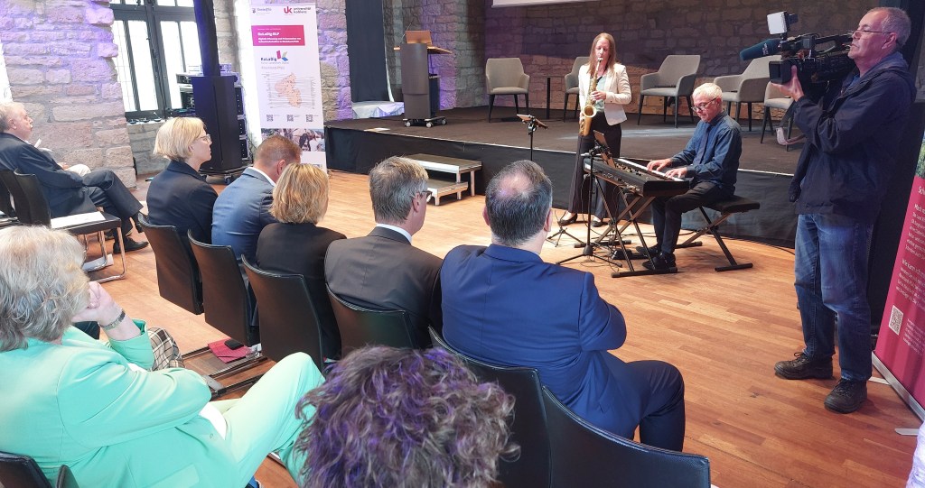 Impressionen der Veranstaltung: Die Podiumsdiskussion mit Stefanie Seiler, Bürgermeisterin in Speyer, Dr. Helmut Winterling vom BASF und Werner Schreiner, Landesregierung, mit SGD-Süd-Präsident Prof. Hannes Kopf und Moderatorin Janina Klabes. Musik gab es von Rebecca Senck und Frank Schäffer.