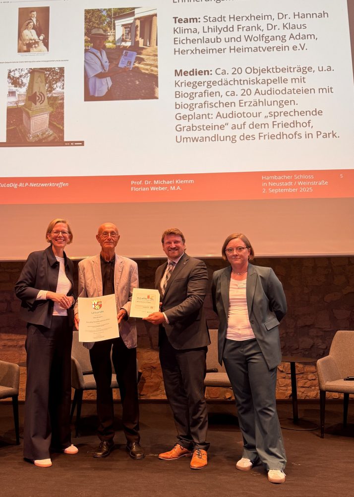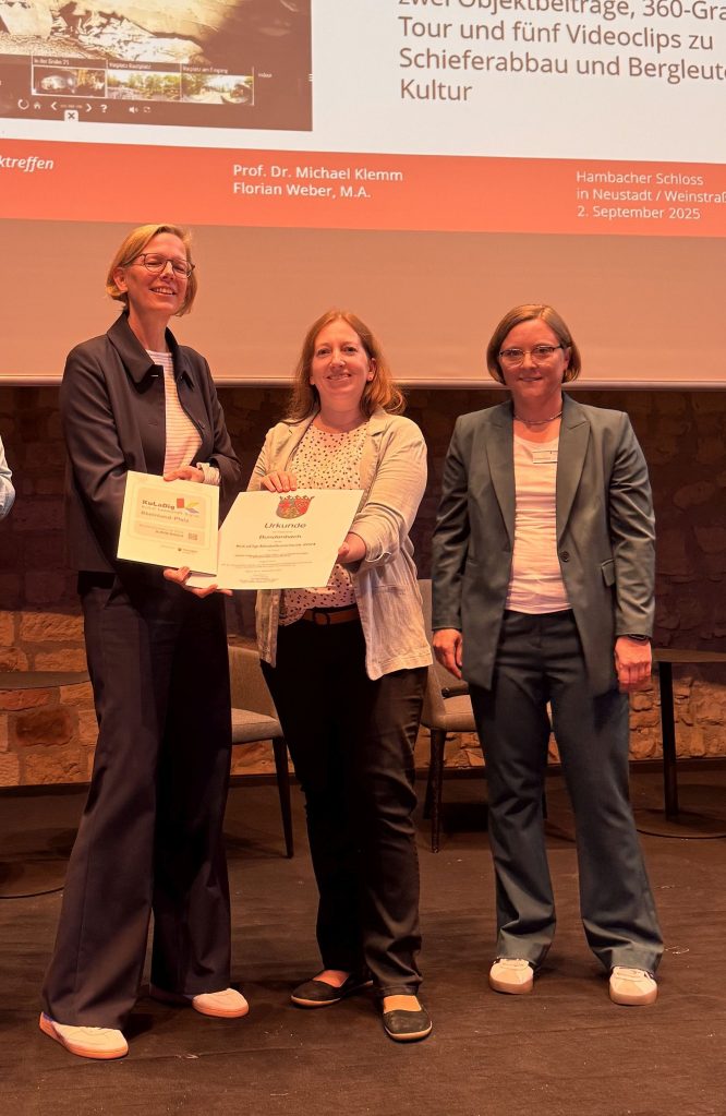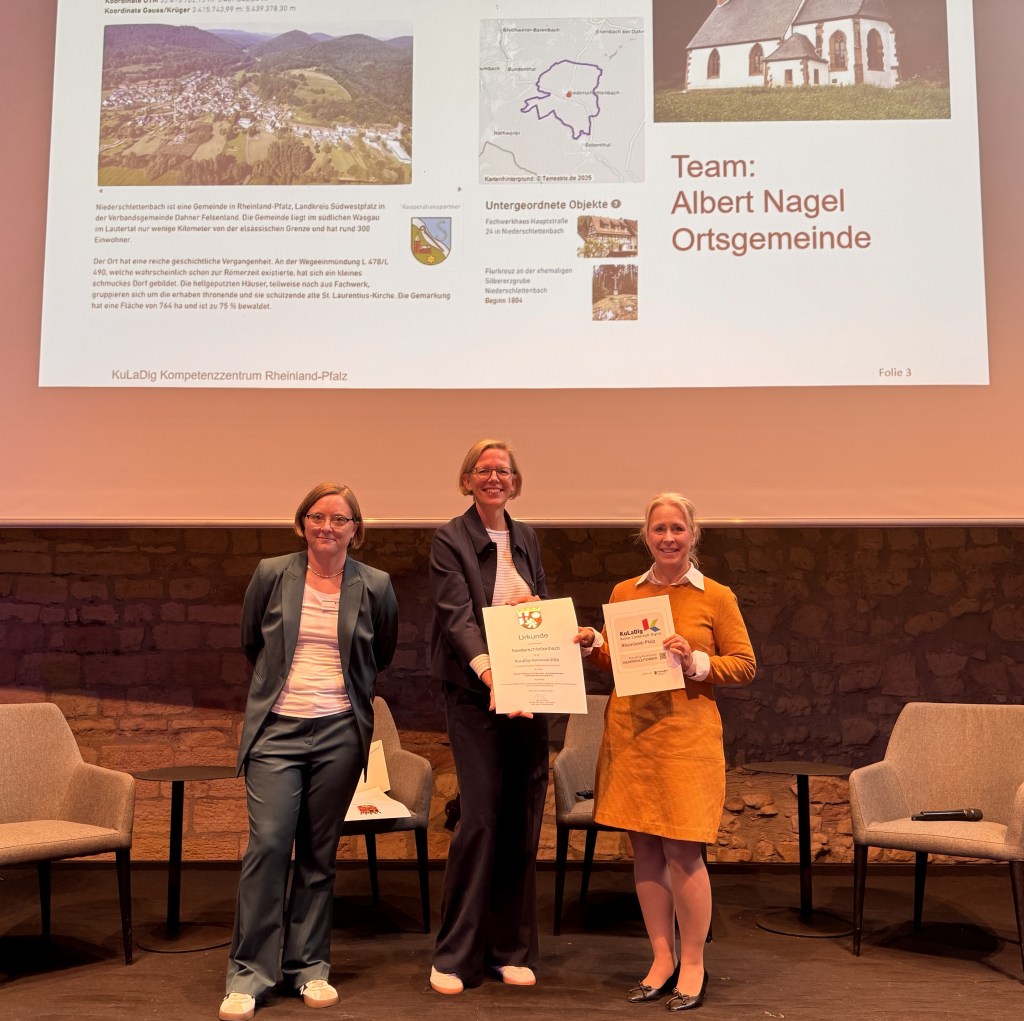 Die Kommunen, die in Rheinland-Pfalz im Landesprojekt KuLaDig-RLP sowie mit Unterstützung des KuLaDig-Kompetenzzentrums eigene Projekte zumeist ehrenamtlich umgesetzt haben, werden von der Staatssekretärin Simone Schneider für ihre Arbeit ausgezeichnet. Florian Weber und Christine Brehm stellten die Kommunen und ihre Projekte vor.