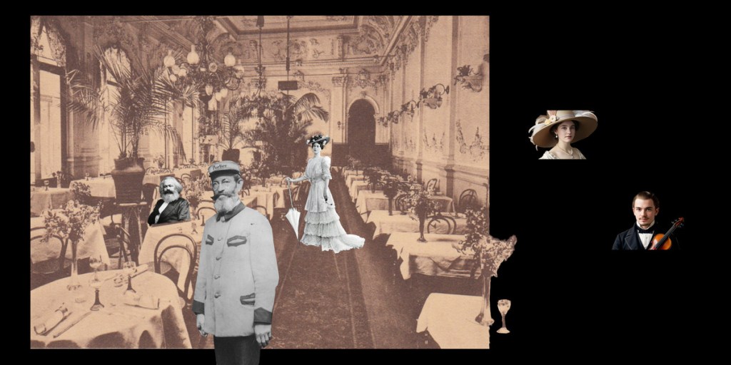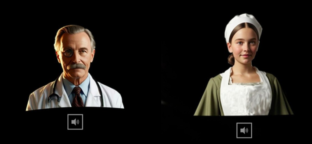 Die Inhalte in KuLaDig zum Thema Kur- und Heilbäderwesen in Bad Neuenahr und Umgebung sind sehr gehaltvoll und eignen sich weniger dazu, den Menschen einen lebendigen und kurzweiligen Einblick in die vielen spannenden Aspekte des Kurortes und seiner Geschichte zu geben. Dazu sollte unter anderem der 360-Grad-Speisesaal dienen. Mittels Collagen-Technik und KI statteten wir diesen mit Personen aus (die Avatare wurden mit Canva erstellt), beispielsweise einem Portier, Karl Marx der hier ein paar Tage logierte, und weiteren, teils fiktiven, aber nach Quellenlage typischen Personen. Für jede Person schrieben wir einen kleinen Monolog. Mithilfe der KI-Anwendung elevenlabs vertonten wir diese Texte und ordneten den Personen die jeweils passende Audiodatei zu.