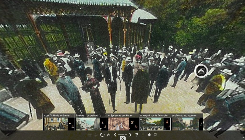 In diesem Jahr haben wir damit begonnen, mittels der 360-Grad-Anwendung vr-easy die Vergangenheit erahnbar zu machen, und zwar in unserem Teilprojekt Bad Neuenahr-Ahrweiler / Sinzig. Die beiden Städte hatten sich mit dem Thema „Kur- und Heilbäderwesen an Ahr und Umgebung“ beworben und es wurde bereits eine Vielzahl an Objektbeiträgen zum Thema in KuLaDig veröffentlicht. Im Rahmen des Projekts wurde durch das Stadtarchiv Ahrweiler ein großer Bestand an historischen Postkarten und Bildern bereitgestellt, die den Kurort Bad Neuenahr zu seiner Blütezeit, also um 1900, abbilden.