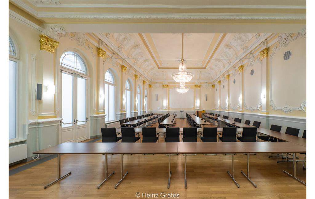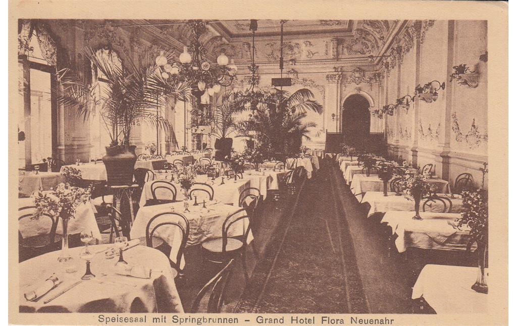 Der heutige Ratssaal im Rathaus von Bad Neuenahr-Ahrweiler zeugt noch vom Prunk der alten Zeit, in der er als Speisesaal des Grand Hotels Flora diente (siehe Bild rechts), dennoch aber würde eine 360-Grad-Aufnahme des heutigen Raumes wenig von der einstigen Atmosphäre vermitteln (Bild links: Heinz Grates).