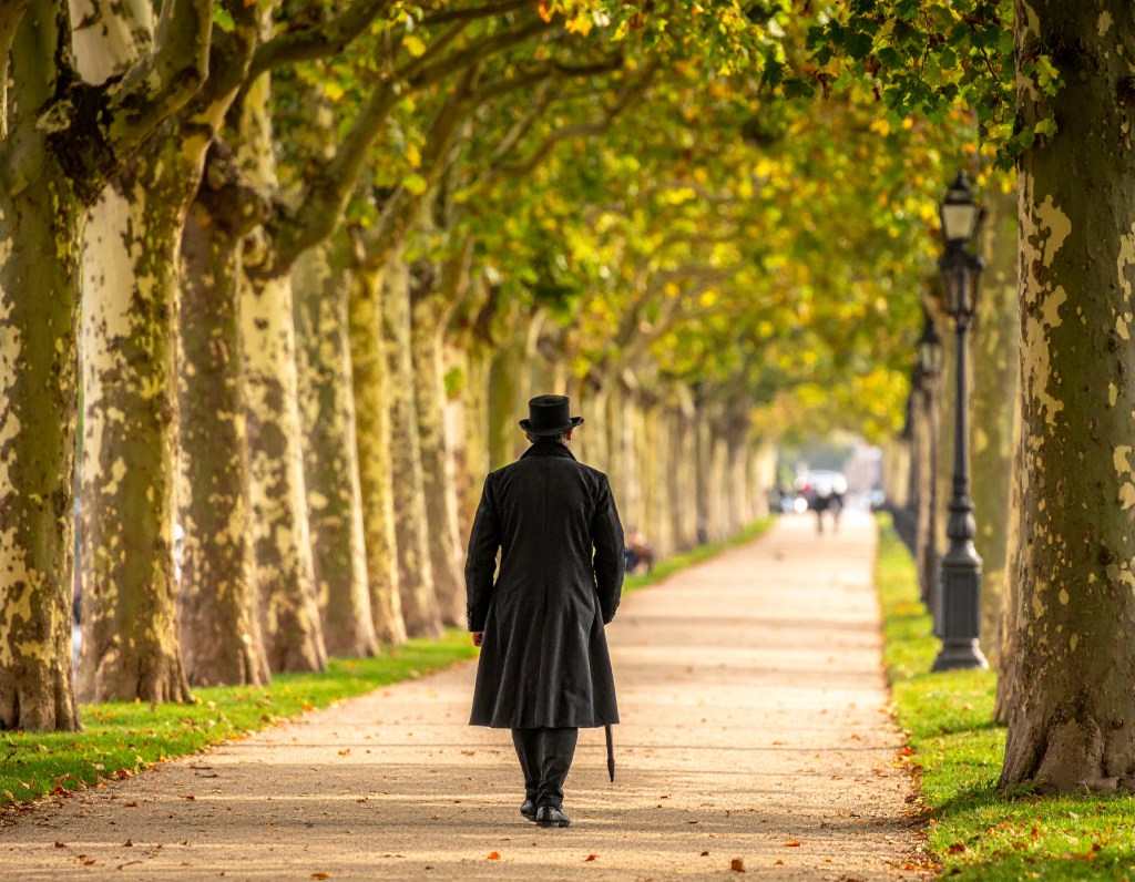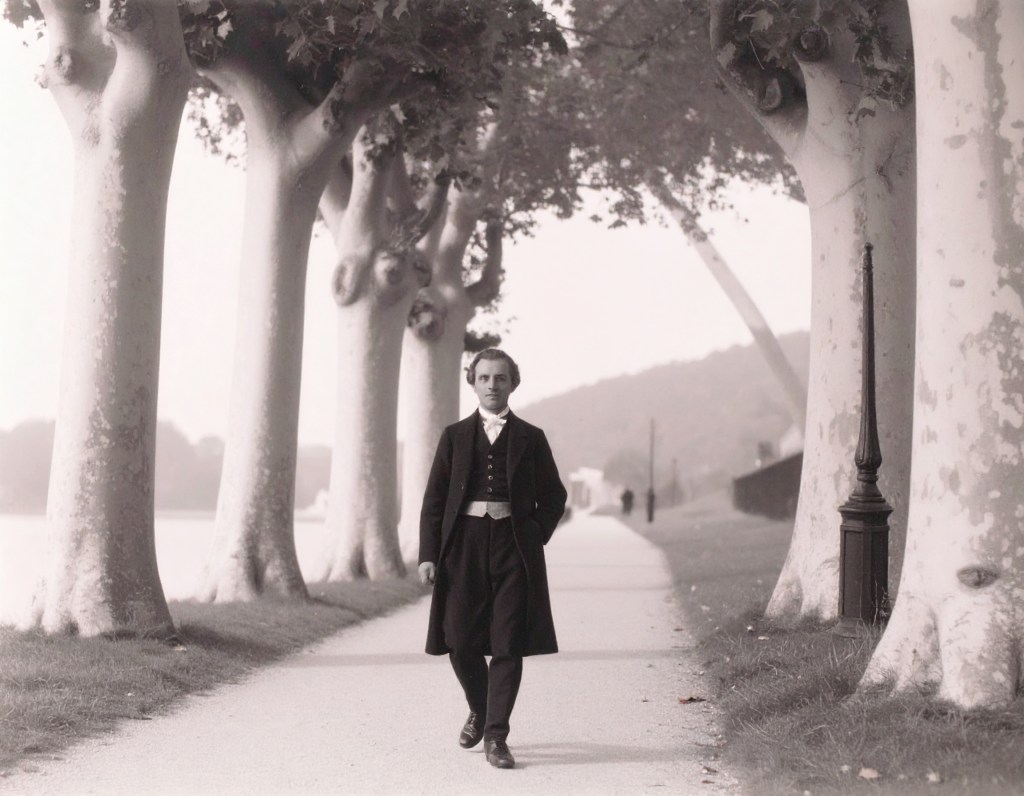 Prompt: „Ein Mann, mitteleuropäischen Aussehens und um die 35 Jahre alt, rasiert, schlank und mit mittellangen lockigen dunklen Haaren ist gekleidet in elegante schwarze Kleidung aus der Mitte des 19. Jahrhunderts mit schwarzem Gehrock und weißer Halsbinde. Er spaziert nachdenklich durch einen menschenleeren Park. Er läuft eine Allee alter und großer Platanen entlang. Rechts ist eine steinerne Bordüre und dahinter sieht man schemenhaft einen Fluss. Die Szene ist fotorealistisch, das Licht ist warm und ein paar Blätter fallen von den Bäumen herunter.“