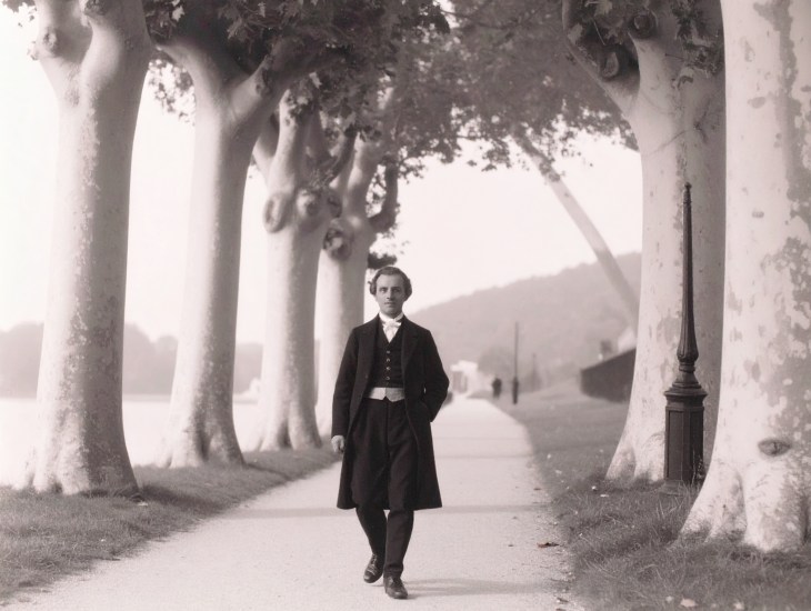 Prompt: „Der Komponist Felix Mendelssohn Bartholdy, in eleganter Kleidung gekleidet im Stil des frühen 19. Jahrhunderts, flaniert die Rheinpromenade entlang, eine Allee aus Platanen, in Koblenz-Horchheim.“