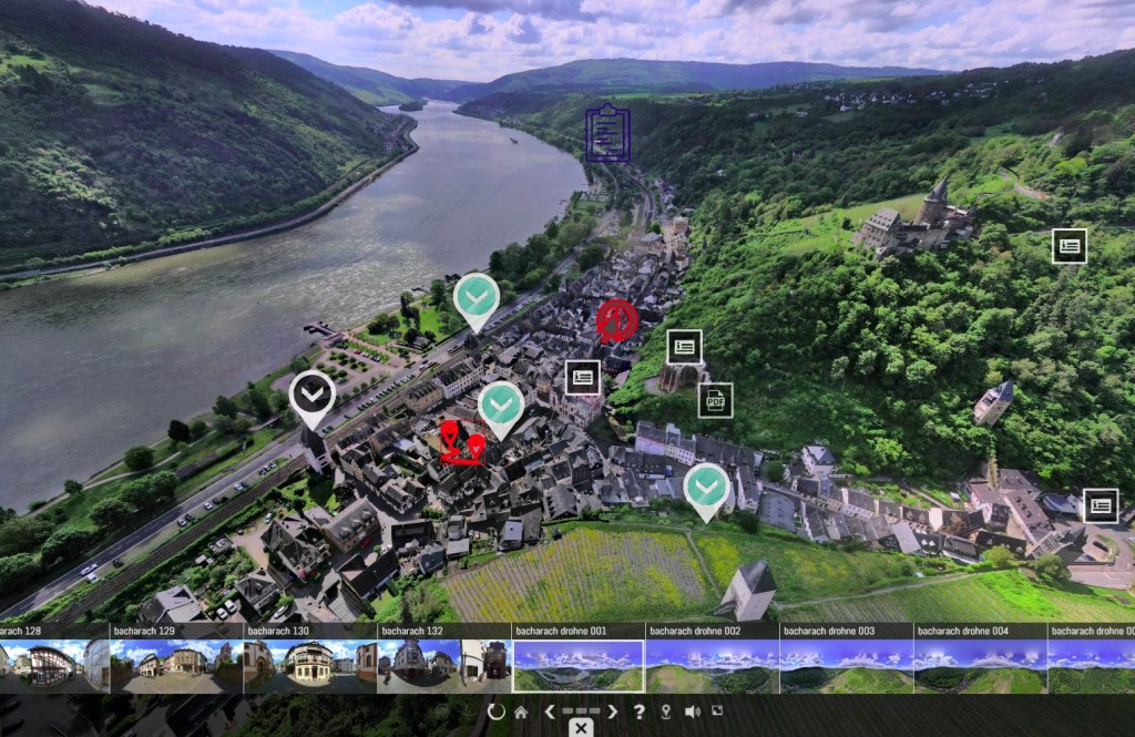 Drohnenübersicht über Bacharach und die Stationen der 360-Grad-Tour durch den Ort (Bild: Büro viriditas)