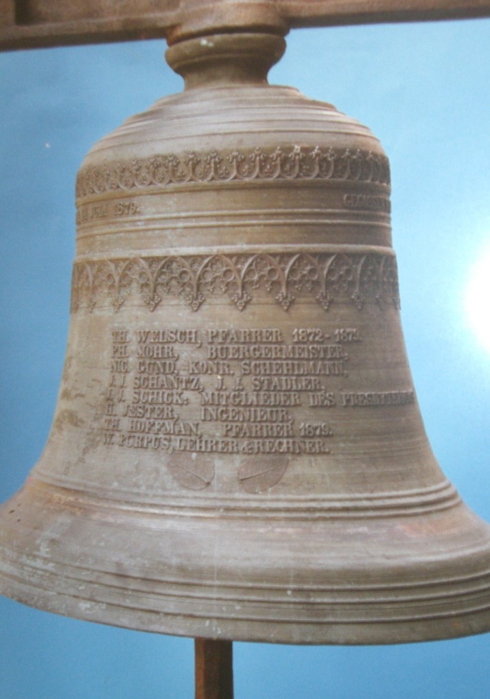 Von der evangelischen Kirche standen am Ende nur noch der Stumpf des Turms und die gemauerten Außenwände. Der Dachstuhl war ein Opfer der Flammen geworden. Der Kirchengemeinde waren vom ursprünglichen Glockengeläut aufgrund der Metallschmelze zu Munitionszwecken im Ersten als auch im Zweiten Weltkrieg nur ein paar Glocken erhalten geblieben. Die kleinste der drei Bronzeglocken aus dem Jahr 1879 hing nun in dem einsturzgefährdeten Kirchturm. Mit seinen Helfern konnte Karl Schehlmann diese Glocke aus dem Turm bergen. Von einem provisorischen Holzgerüst im ausgebrannten Kirchenschiff aus rief sie die Gläubigen nach dem Zweiten Weltkrieg weiterhin zum Gottesdienst.