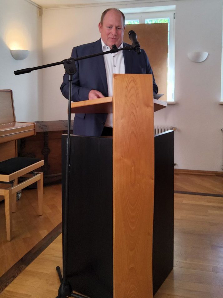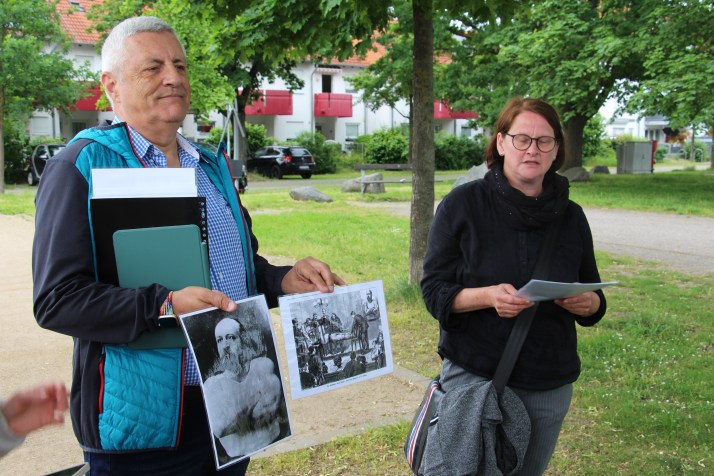 Bürgermeister Thorsten Leva eröffnet die KuLaTour, Michael Ceranski vom Historischen Verein der Pfalz e.V. Ortsgruppe Mutterstadt präsentiert einen Stationen-QR-Code.