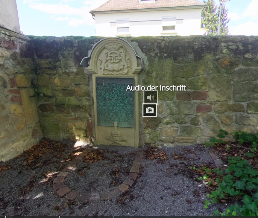 Beispiele für die Integration von Medien in die 360-Grad-Ansichten, um eine zeitgemäße und intuitive Wissensvermittlung zu gestalten: Im Überblickspanorama erläutert der Bürgermeister von Mutterstadt die Tour (links), die Inschrift am Grab der Brezelfrau wird in einem Audio vorgelesen (Mitte) und Einbettung von KuLaDig-Objekten und Sprungmarken zu anderen 360-Grad-Touren (s. Beitragsbild).