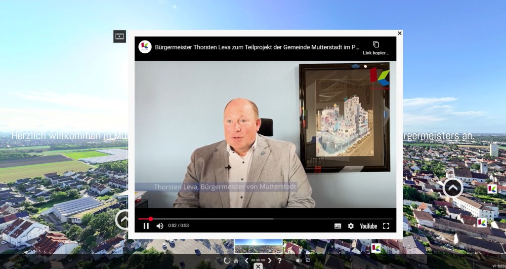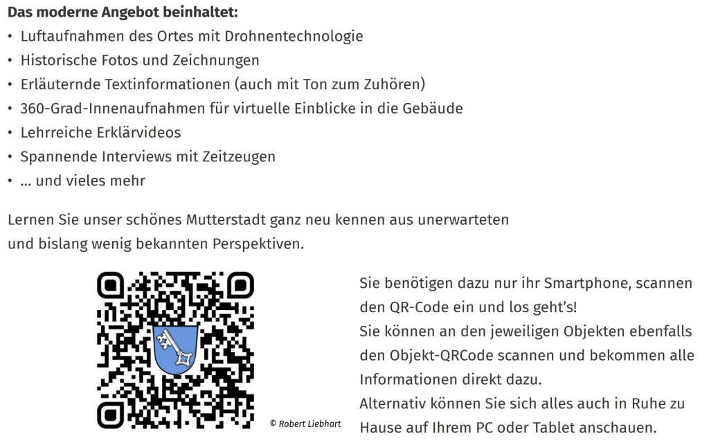 So wurde Mutterstadt KuLaDig-RLP-Modellkommune des Jahres 2024 und es entstand ein breites digitales Angebot rund um 15 ausgewählte kulturhistorisch bedeutsame Objekte und Orte, finanziert durch die Anschubfinanzierung des Projekts und Eigenmittel. Neben den KulaDig-Objekten sind die 360-Grad-Drohnenaufnahmen und -touren, beispielsweise durch das historische Rathaus, heute Museum, die protestantische und die katholische Kirche und über den Friedhof hervorzuheben. Sie machen die jeweiligen Örtlichkeiten barrierefrei erlebbar und haben den Vorteil, gezielt Medien an den jeweils passenden Plätzen verorten zu können. Beeindruckend auch die von Studierenden produzierten Zeitzeugenvideos, etwa zur Reichsprogromnacht 1938 (zu finden über den Objektbeitrag zur ehemaligen Synagoge).