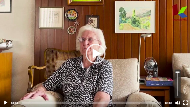 Die Zeitzeugin Irmgard Metzger (geb. 1927) aus Mutterstadt erzählt vom Brand der Synagoge von Mutterstadt während der Reichspogromnacht im Jahre 1938 durch die Nationalsozialisten (links), Rekonstruktion der zerstörten Synagoge (rechts).