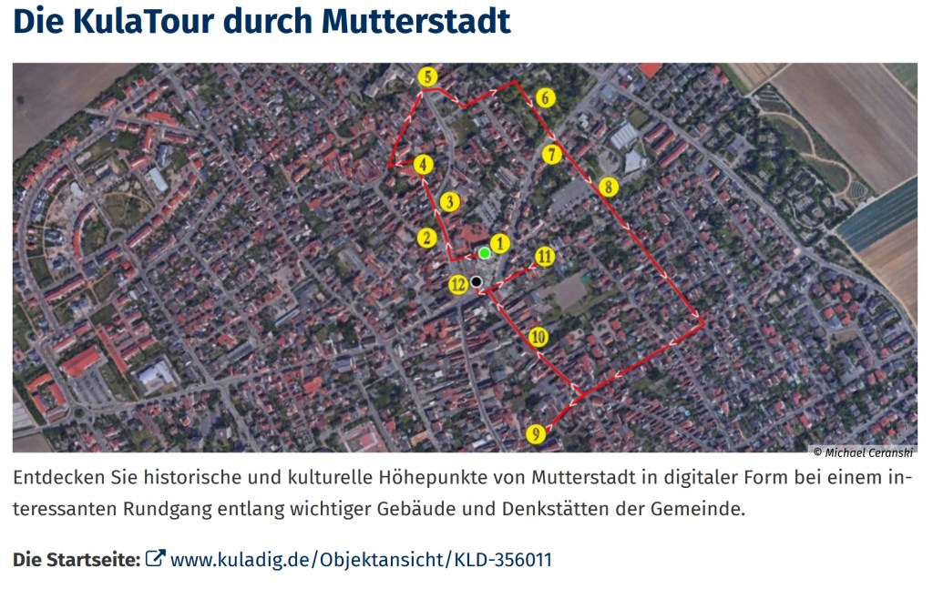 Im Frühjahr letzten Jahres wurde die Tour mit dem Titel „Über 1250 Jahre Mutterstadt: Von Türmen, Pforten und dem stärksten Mann der Welt“ eröffnet. Im Ort selbst ermöglichen bereits an verschiedenen Objekten QR-Codes den unmittelbaren Zugang zu den digitalen Angeboten, weitere QR-Code-basierte Stationen sollen zeitnah ergänzt werden. Darüber hinaus wurde eine gleichnamige KuLaTour für die mobile Nutzung mit der KuLaDig-App erstellt.