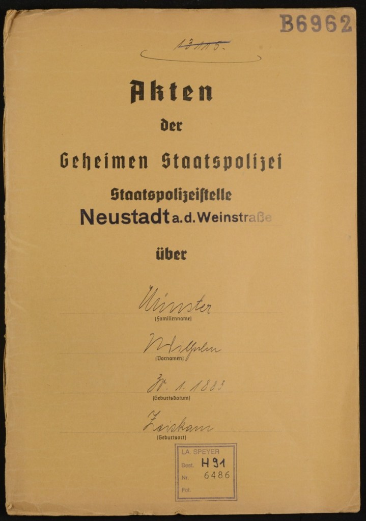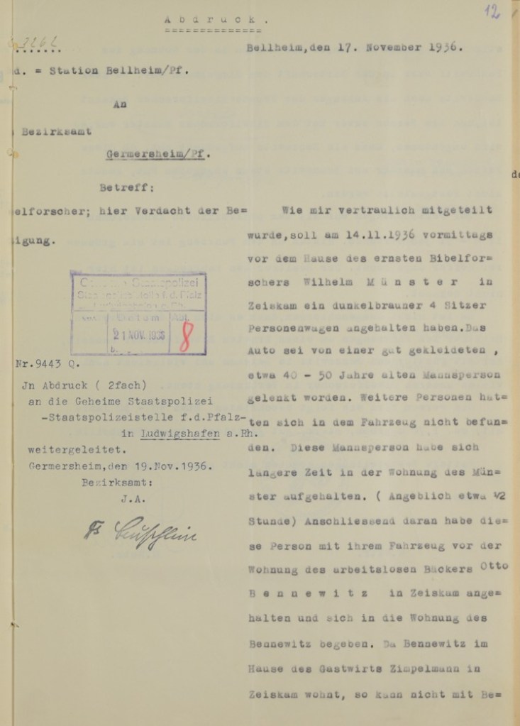 Am 17. November 1936 wird im Polizeirevier in Bellheim ein zweiseitiger Bericht an das Bezirksamt in Germersheim (Pfalz) in die Schreibmaschine getippt. Ein Abdruck geht an die Geheime Staatspolizei in Ludwigshafen. Der Bericht dient der Schilderung einer verdächtigen Person, die in Zeiskam gesichtet wurde und sich nahe der Häuser von als „staatsfeindlich“ definierten Personen aufgehalten haben soll, woraus ein dringender Verdacht abgeleitet wird, dass es sich um eine ebenfalls um einen Staatsfeind handeln könne. Die Person ist männlich, etwa 40 bis 50 Jahre alt, ca. 1,70 Meter groß, gut gebaut und ebenso gut gekleidet. Auffälliges Merkmal ist die dicke Hornbrille. Der Verdächtige fährt einen dunkelbraunen PKW mit dem amtlichen Kennzeichen IV B-51 368. Nachdem dieser Bericht bei den adressierten Stellen eingegangen ist, drehen sich weitere Rädchen im System. Das verdächtige Subjekt wird identifiziert und zum Verhör geladen – oder vielleicht gleich verhaftet?