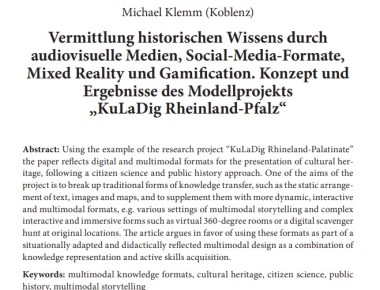Gerade erschienen ist ein Aufsatz von Projektleiter Michael Klemm, in dem er das Konzept und wesentliche Erkenntnisse der ersten fünf Jahre des Landesprojekts KuLaDig-RLP ausführlich vorstellt und an etlichen Beispielen diskutiert. Der Beitrag reflektiert den […]