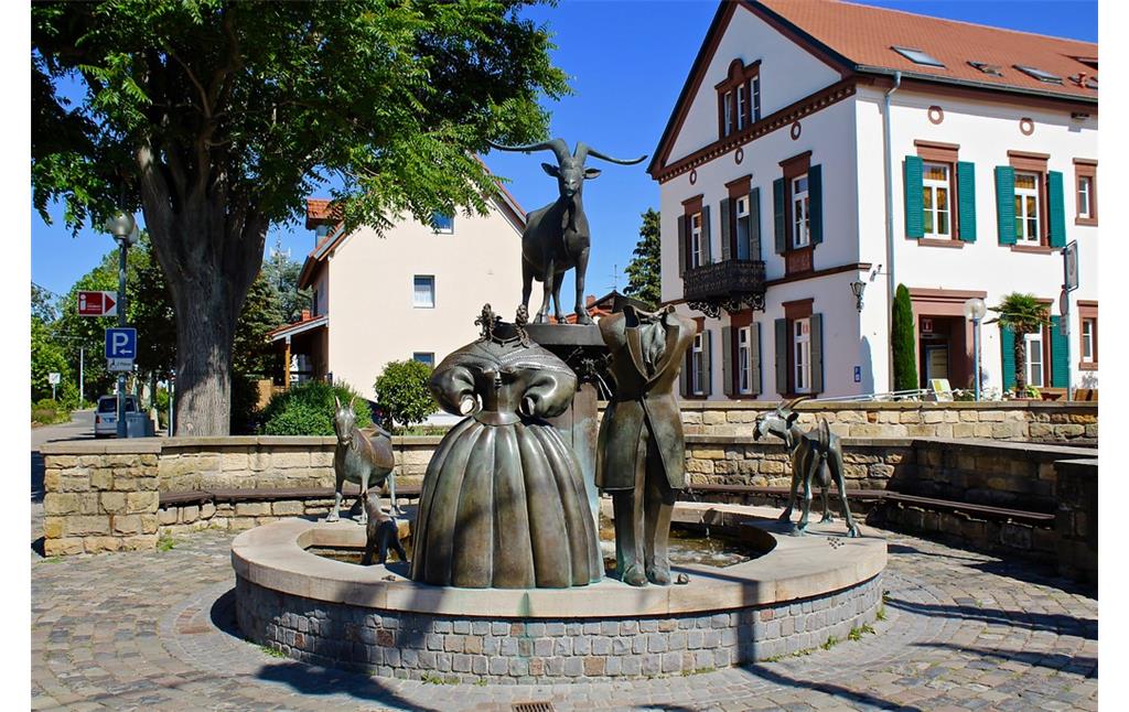 Der Geißbockbrunnen am Stadtplatz weist auf die seit 700 Jahren stattfindende Geißbockversteigerung hin, eine der ältesten Traditionen in der Pfalz.