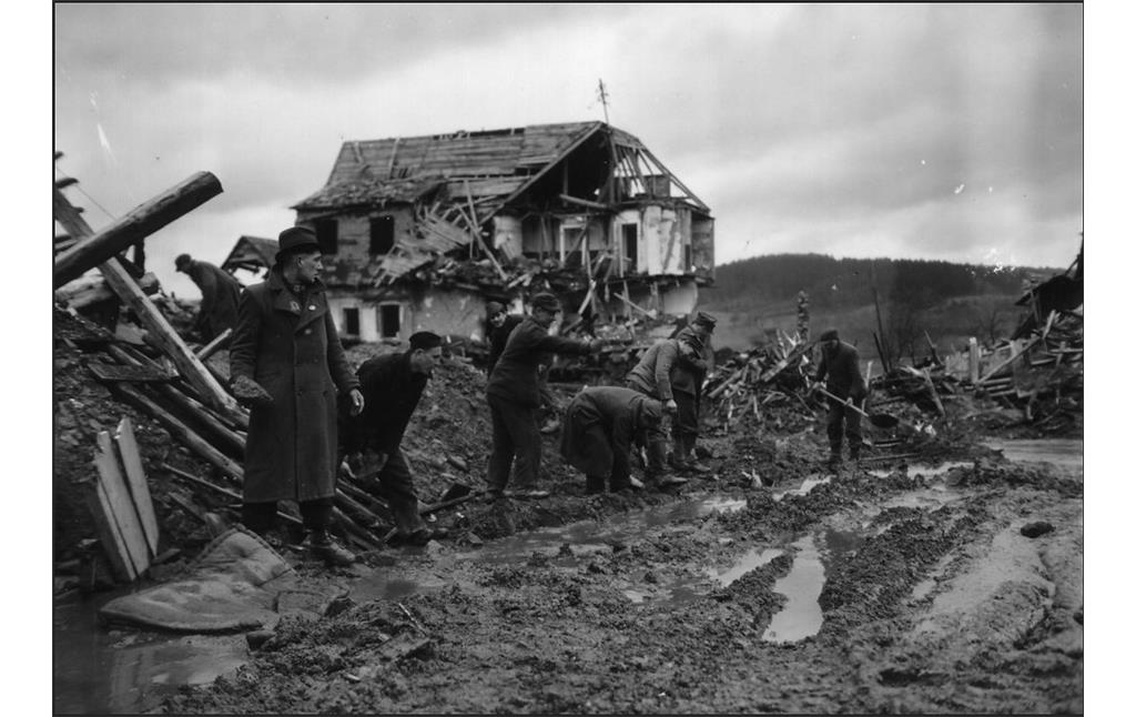 Aufräumarbeiten in Kelberg nach dem Bombenangriff 1944.