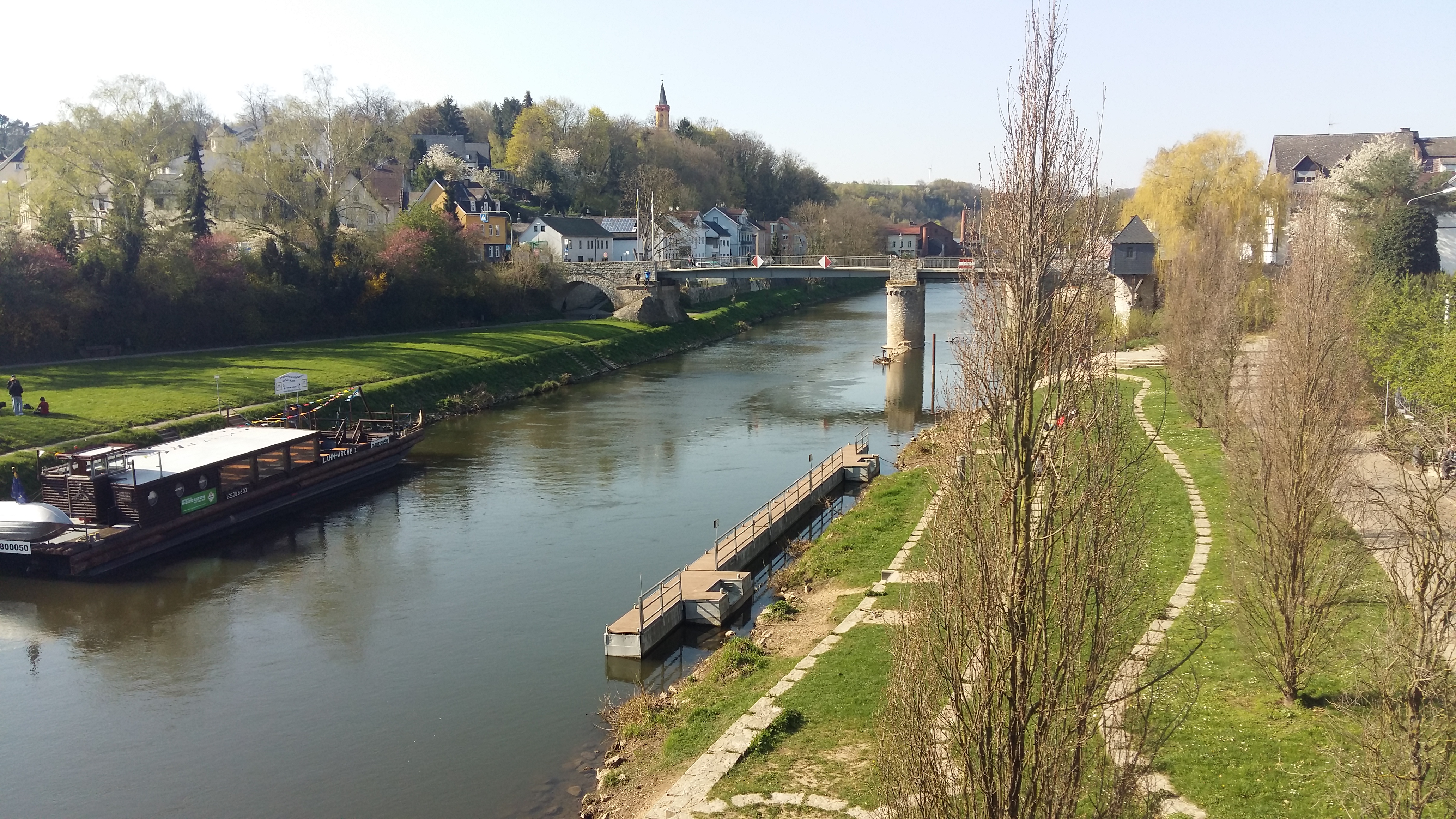 Der heutige Blick auf Lahn und Lahnbrücke.