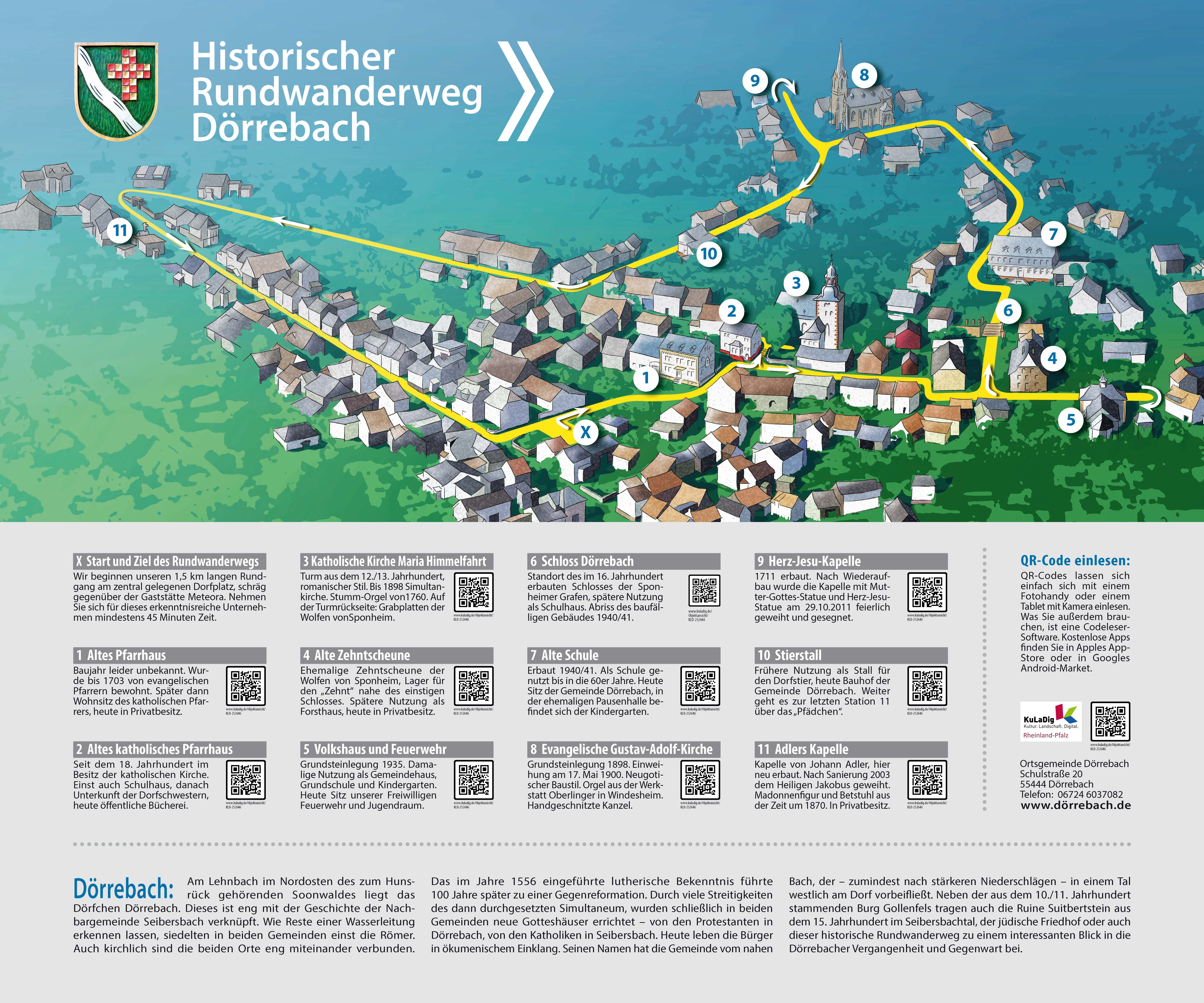 Entwurf der Infotafel für den Rundweg in Dörrebach – an jeder Station ist ein KuLaDig-Objekt abrufbar (die QR-Codes sind noch Muster)