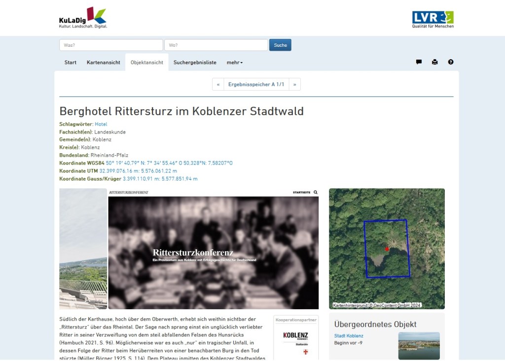 Auf der Seite werden über Textlinks passende KuLaDig-Objekte angeboten. Vom KuLaDig-Beitrag des Berghotels Rittersturz aus wird sowohl über einen Screesnhot in der Mediengalerie, als auch über einen Textlink die Seite ansteuerbar gemacht.