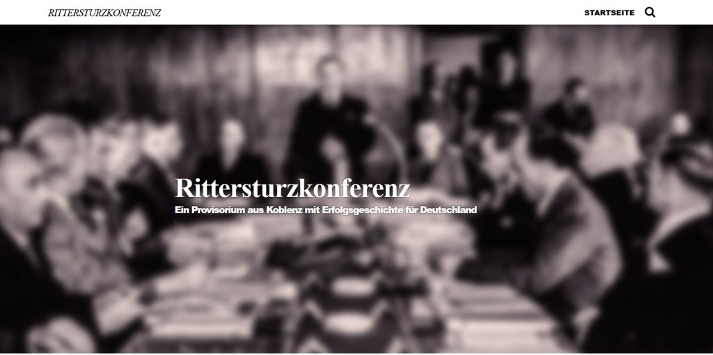 Screenshot der Startseite der Seite „Rittersturzkonferenz. Ein Provisorium aus Koblenz mit Erfolgsgeschichte für Deutschland“, erstellt von apl. Prof. Dr. Stefan Meier, Medienwissenschaftler an der Uni Koblenz