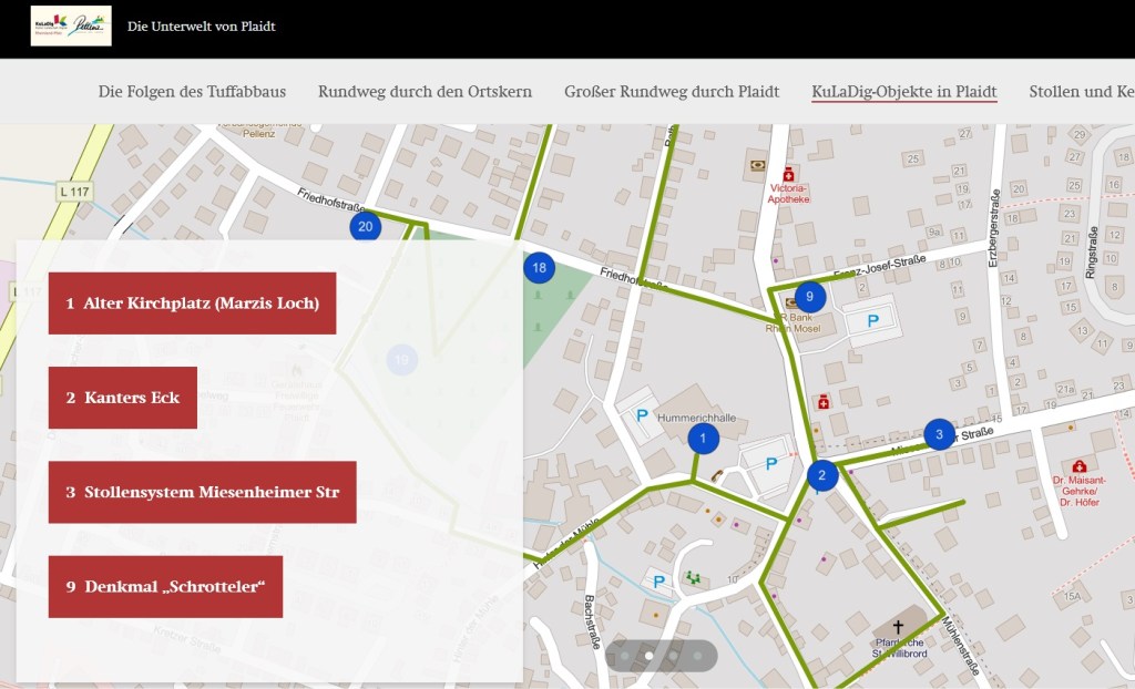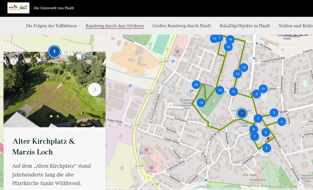 Die Storymap zu Plaidt enthält Textabschnitte und vier interaktive Karten, die unterschiedliche Fragestellungen bzw. Objektzusammenstellungen anbieten. Im „Rundweg durch den Ortskern“ werden 20 Orte und Objekte in einer Tour durch das Zentrum von Plaidt zusammengestellt. Alle Punkte in der Karte lassen sich anklicken und bieten dann Informationen zum jeweiligen Objekt in einem Pop-up-Fenster.