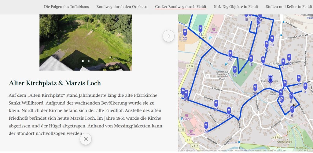 Der Abschnitt „Großer Rundweg durch Plaidt“ enthält einen Textteil (links) und eine Karte (rechts). Den Textteil kann man scrollen, so dass man die Objekte (insgesamt 30) nacheinander angezeigt bekommt. Je nach Objektanzeige im linken Abschnitt wechselt auch die Objektverortung in der Karte.