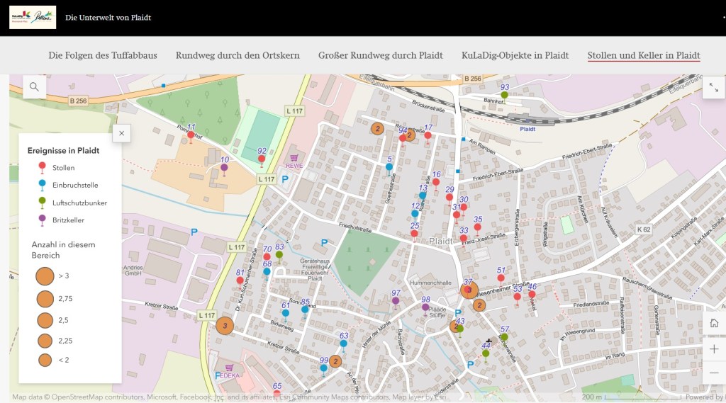Screenshot der Karte „Stollen und Keller in Plaidt“, in der die Standorte von vier verschiedene Objekttypen dokumentiert werden.