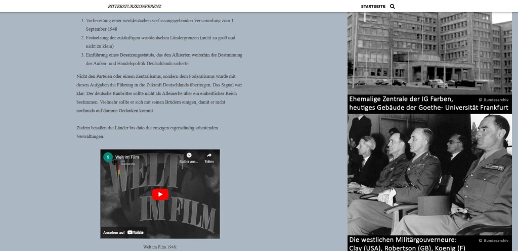Screenshot der Seite „Rittersturzkonferenz. Ein Provisorium aus Koblenz mit Erfolgsgeschichte für Deutschland“ mit einem Videoclip, historischen Bildern und erläuterndem Textabschnitt.