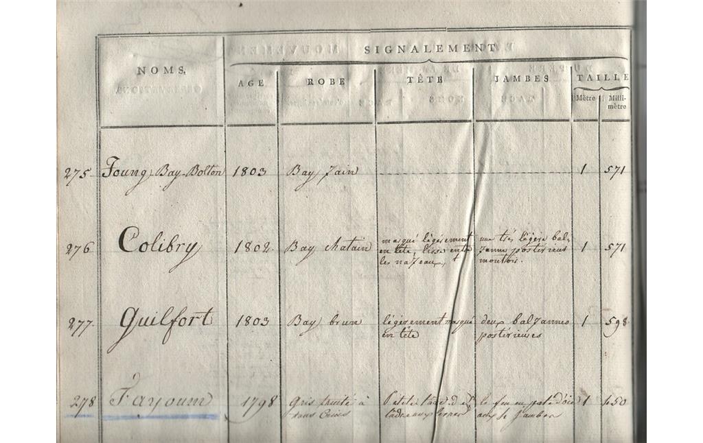 Zuchtliste, u.a. mit Napoleons Hengst Fayoum.